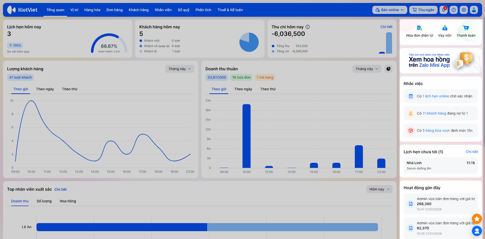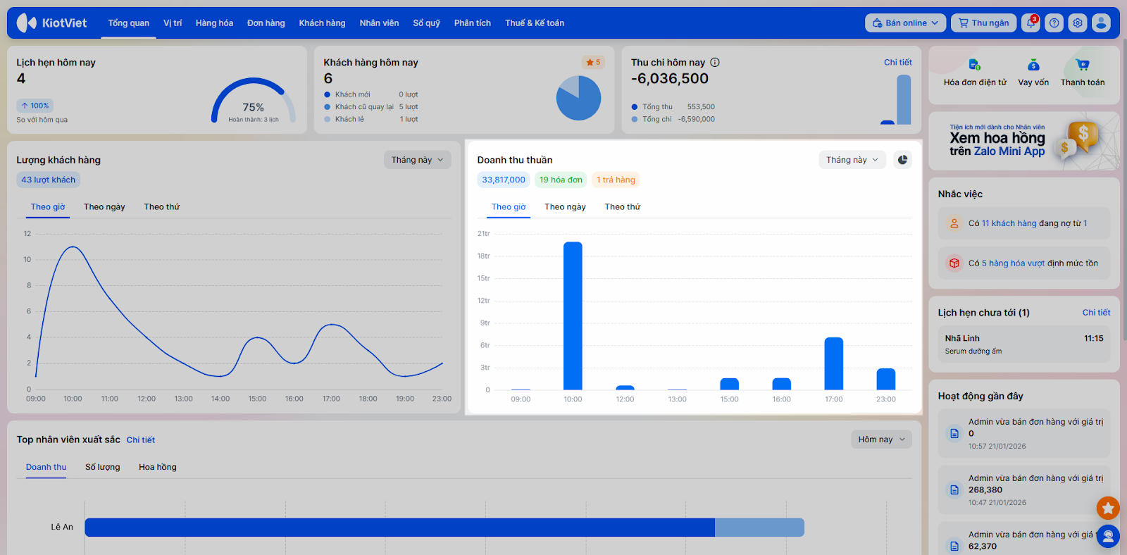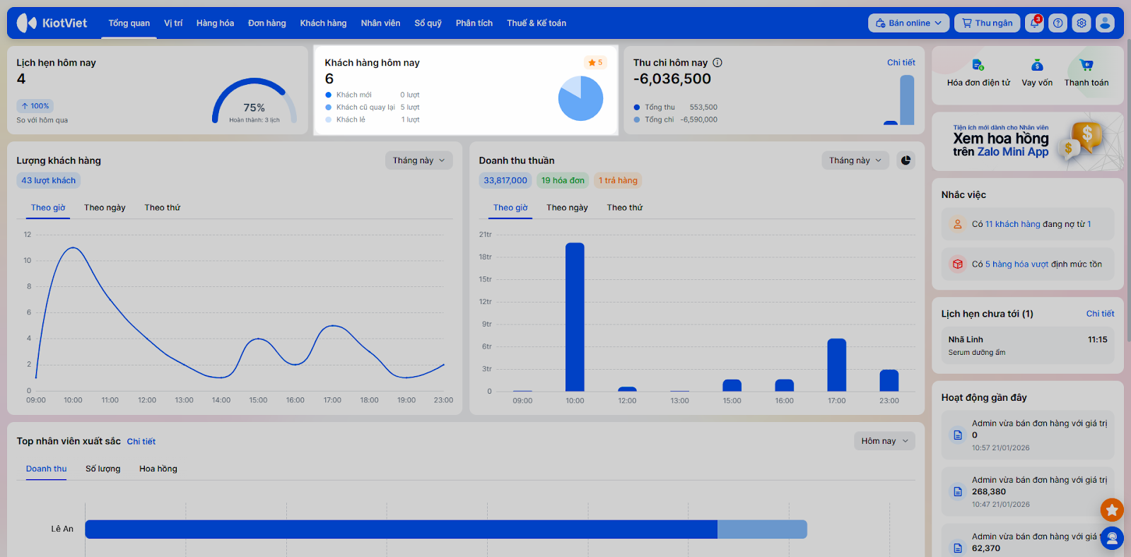 - Khách hàng hôm nay: Thể hiện lượt khách trong ngày.