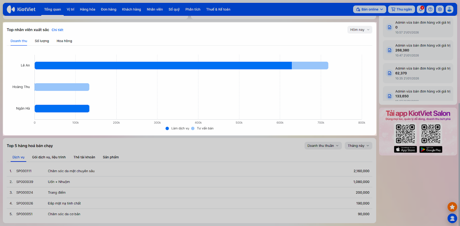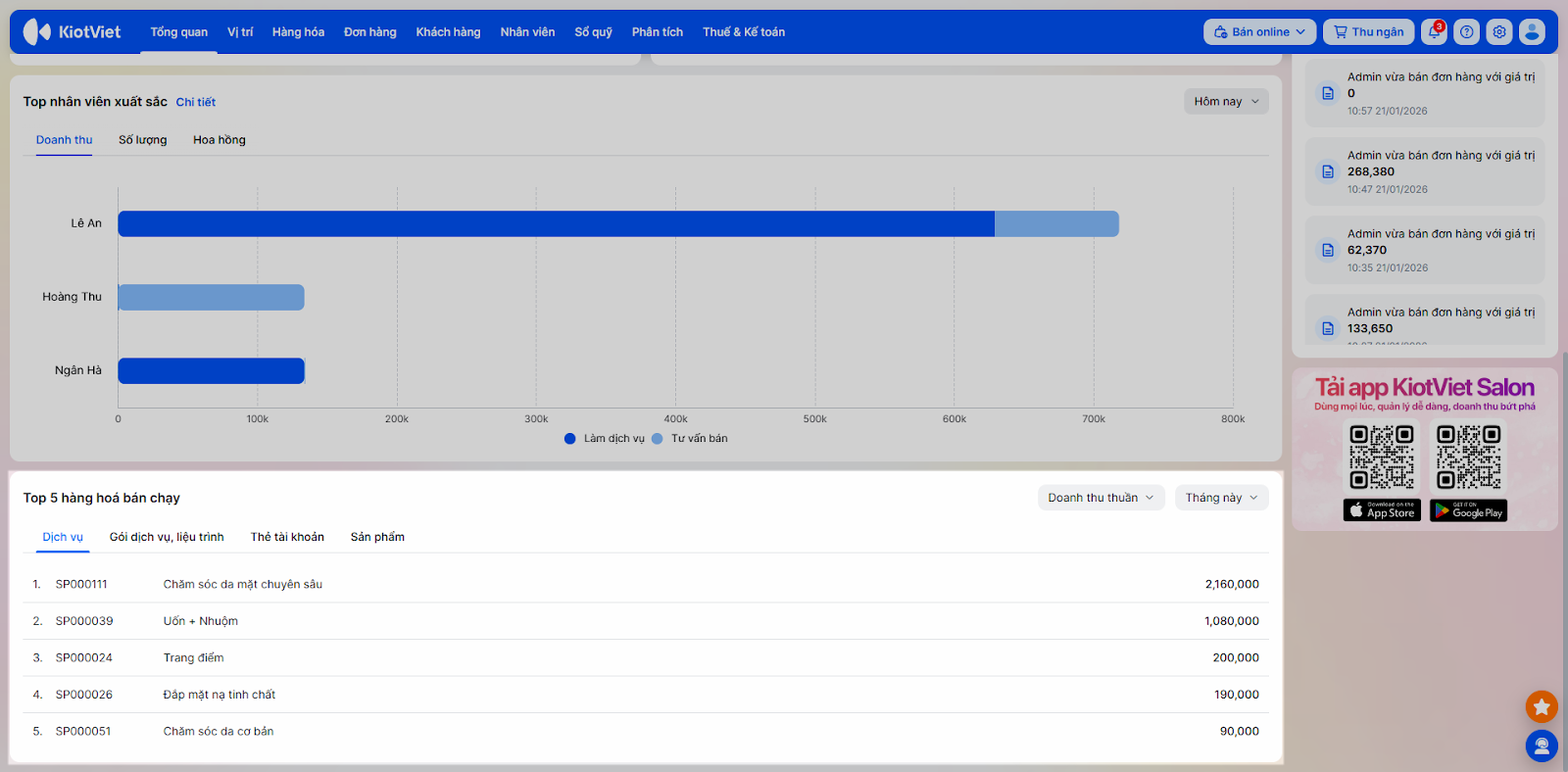 - Phân tích xu hướng: Biểu đồ trực quan giúp nhận diện khung giờ cao điểm, dịch vụ “hot” để điều phối nhân sự phù hợp.