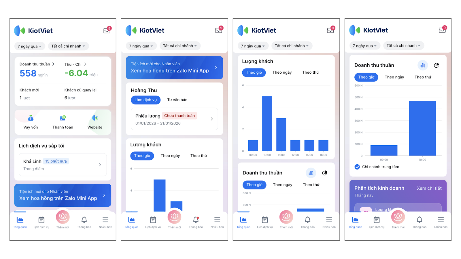 - Lượng khách: Biểu đồ thể hiện số lượt khách tính theo hóa đơn và lịch hẹn theo giờ/ theo ngày/ theo thứ.
