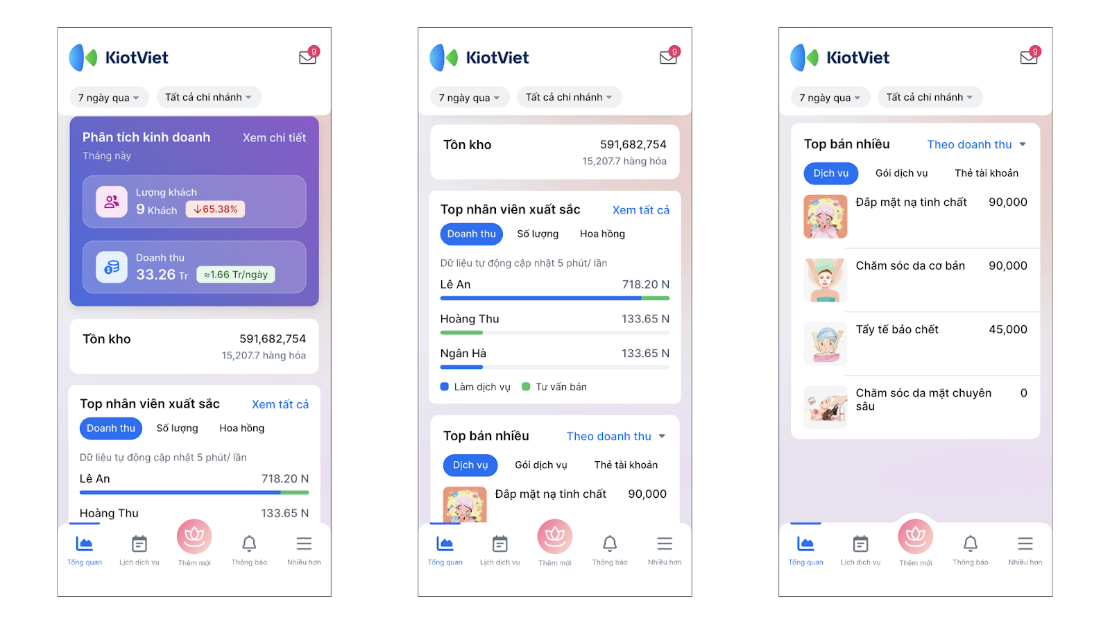 - Cập nhật thời gian thực: Theo dõi ngay lập tức số lượng khách đang làm dịch vụ, doanh thu phát sinh và dòng tiền thu chi trong ngày.