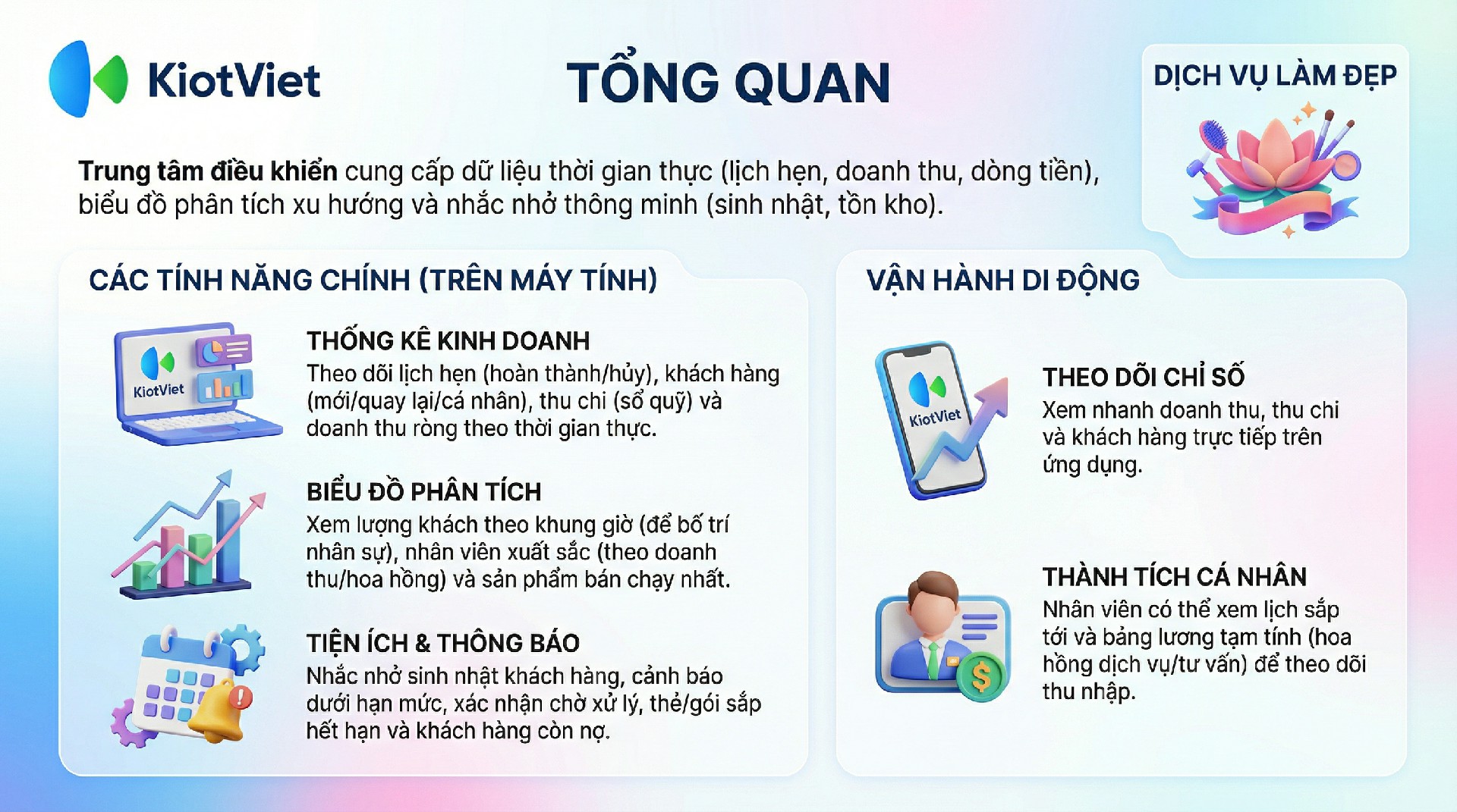 Màn hình Tổng quan trên phiên bản Web được chia thành 3 khu vực thông tin chính, hỗ trợ chủ Salon bao quát toàn bộ hoạt động.