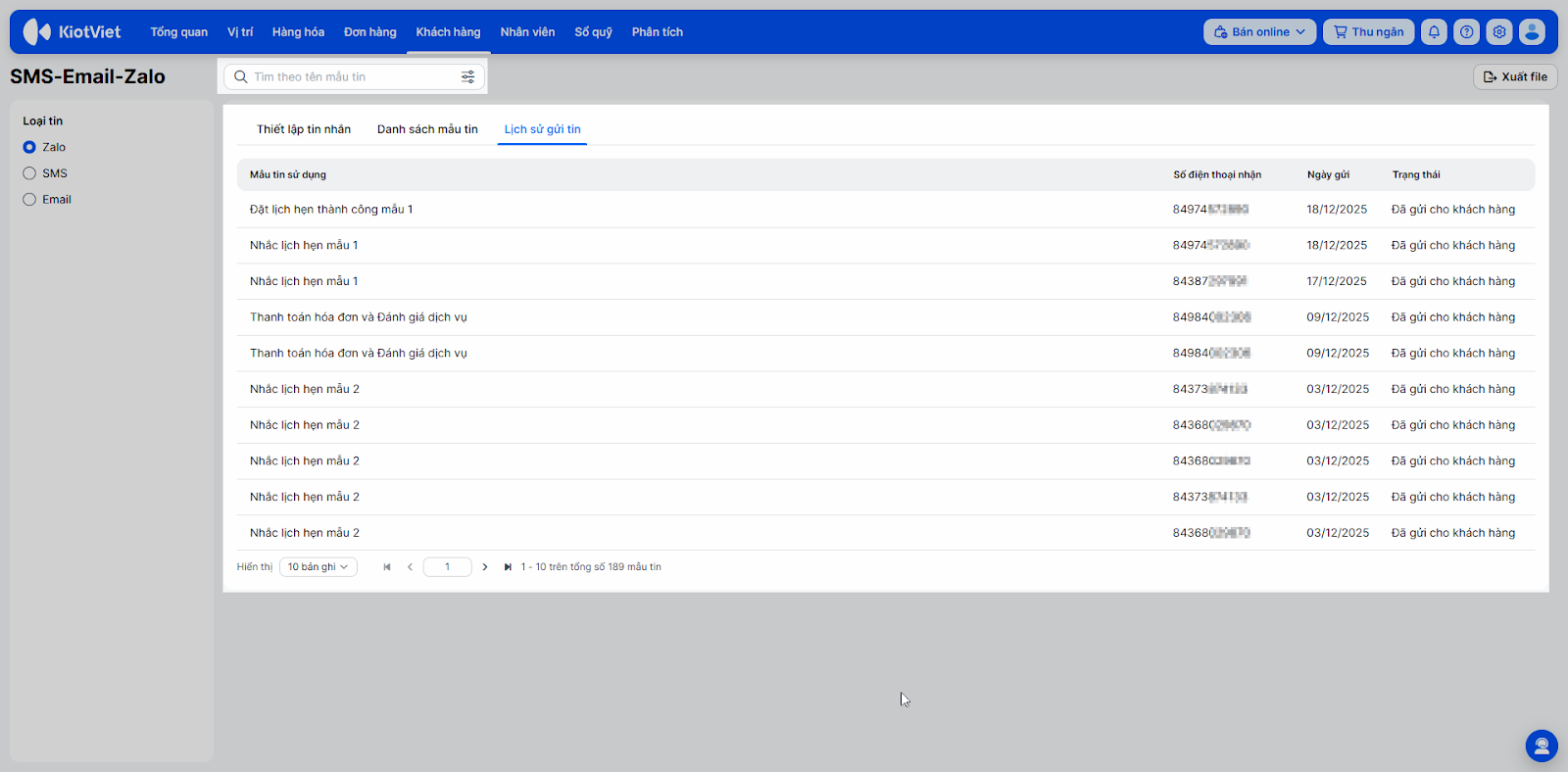 - Tình huống: Một khách hàng phản hồi chưa nhận được tin nhắn nhắc lịch. Bạn cần kiểm tra lại xem hệ thống đã gửi tin nhắn đó đi chưa và trạng thái gửi như thế nào.