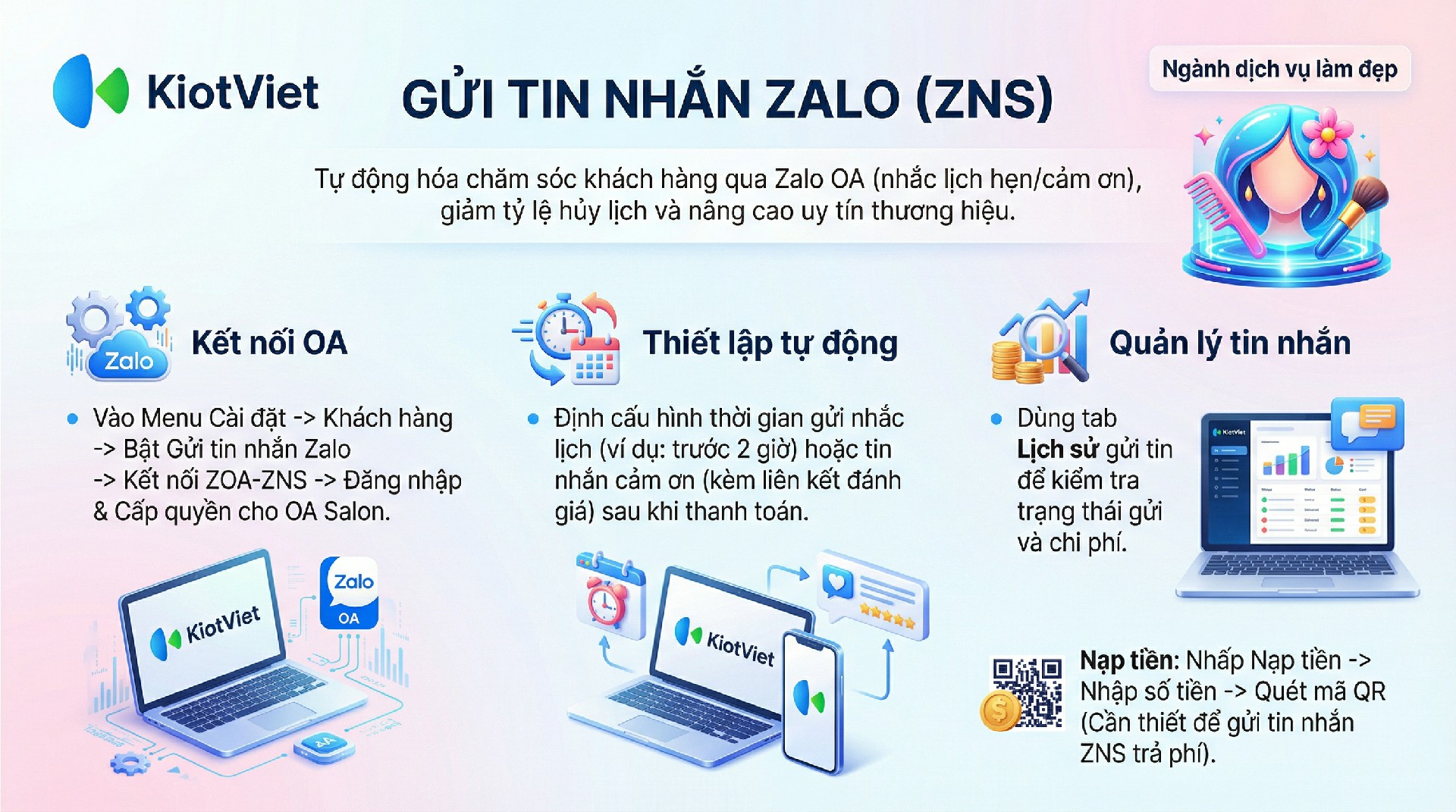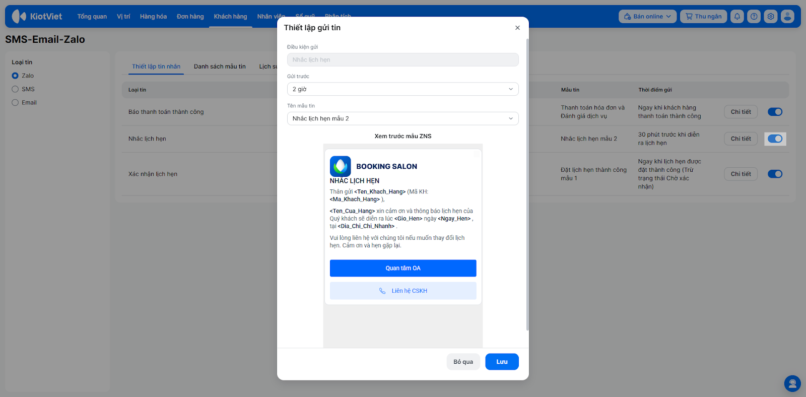 Tính năng Gửi tin nhắn Zalo (ZNS) trên KiotViet hỗ trợ các Salon/Spa thực hiện quy trình chăm sóc khách hàng một cách tự động và chuyên nghiệp thông qua tài khoản Zalo Official Account (ZOA). Thay vì phải thao tác thủ công để nhắn tin nhắc lịch hay cảm ơn từng khách hàng, hệ thống sẽ tự động gửi tin nhắn thương hiệu (Brandname) ngay khi khách thanh toán hoặc sắp đến giờ hẹn làm dịch vụ.