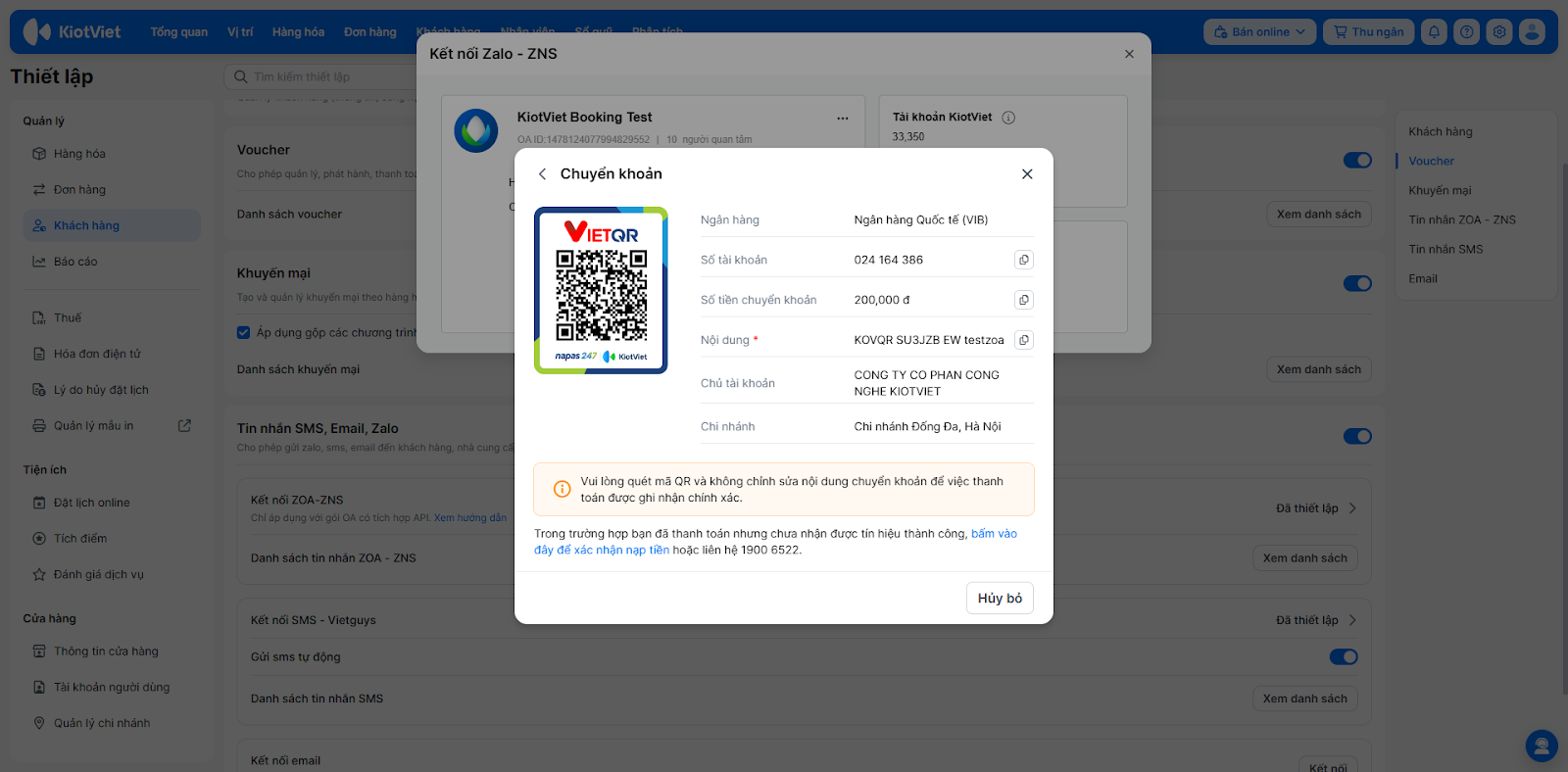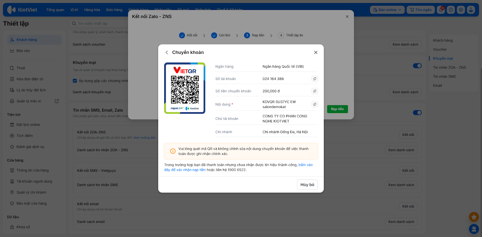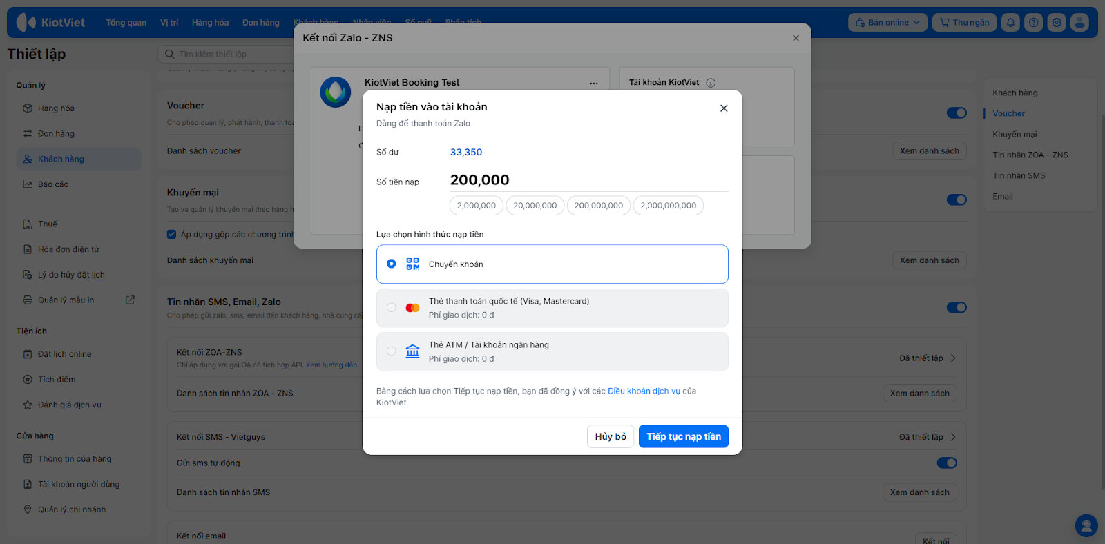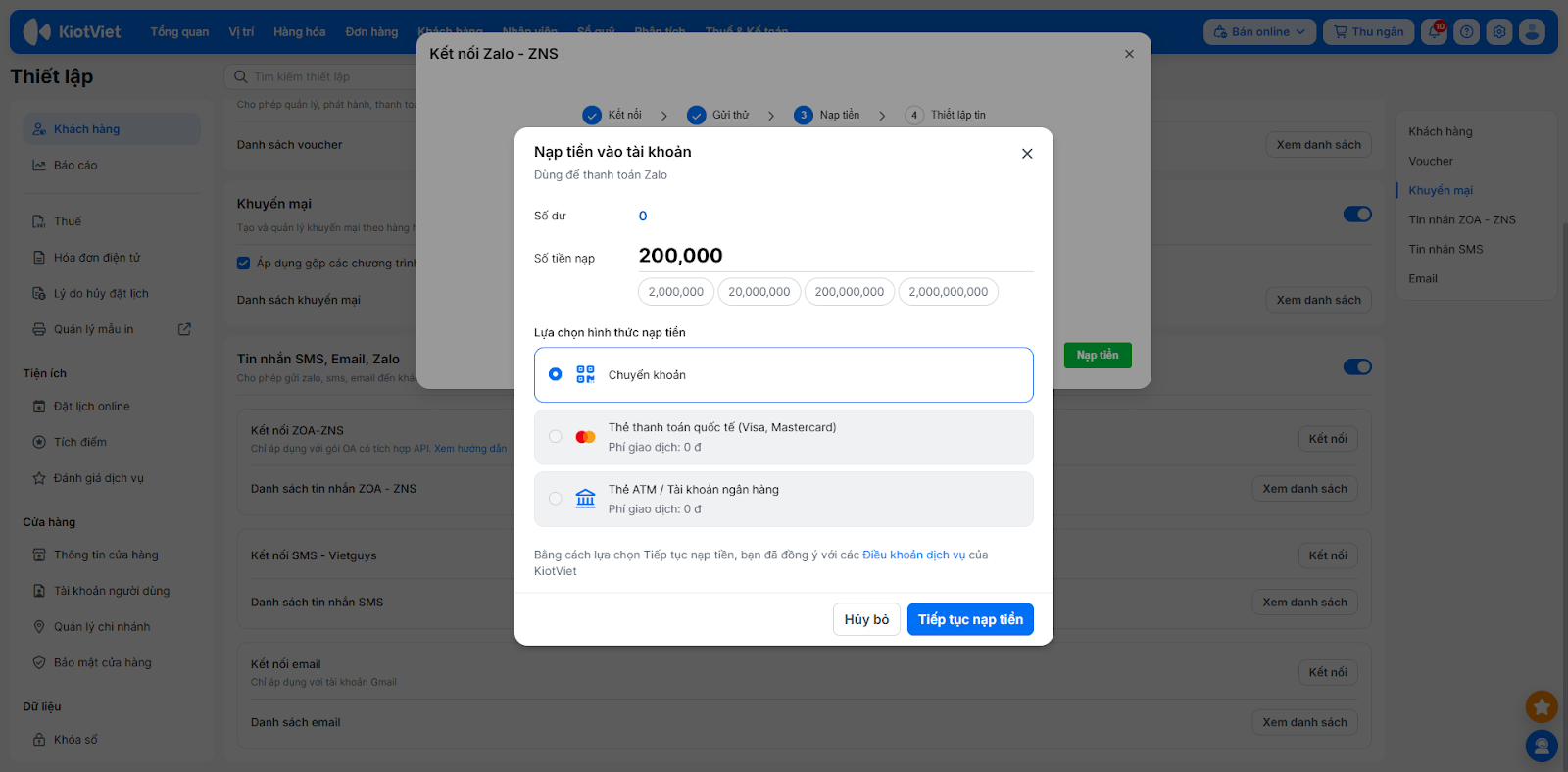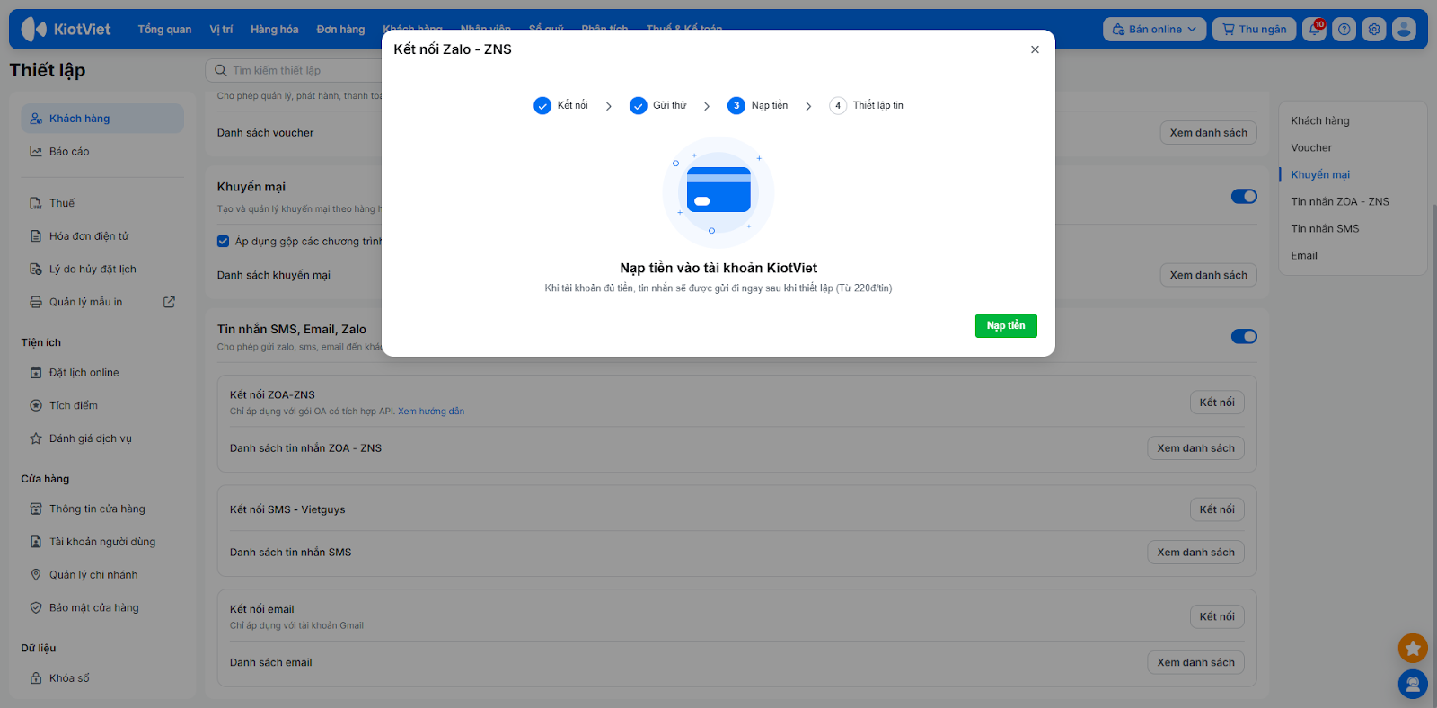 - Tình huống: ZNS là dịch vụ tính phí của Zalo. Để đảm bảo tin nhắn nhắc lịch hẹn hoặc cảm ơn khách hàng được gửi đi liên tục, bạn cần nạp tiền vào tài khoản KiotViet để hệ thống trừ dần chi phí khi gửi tin.