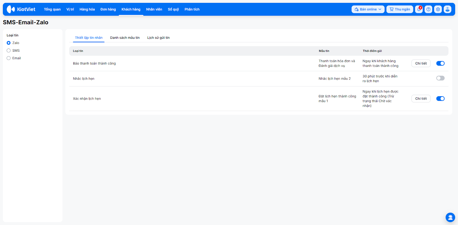 - Màn hình SMS-Email-Zalo (truy cập từ menu Thiết lập → Khách hàng → Xem danh sách tin nhắn ZOA -ZNS hoặc từ menu Khách hàng → Tin nhắn Zalo/SMS/Email), hiển thị danh sách cá mẫu tin hỗ trợ (Báo thanh toán thành công, Nhắc lịch hẹn, Xác nhận lịch hẹn) trạng thái mặc định là tắt..