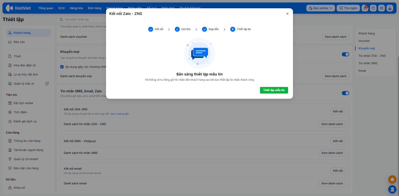- Hệ thống chuyển đến bước Thiết lập tin, bạn kích Thiết lập mẫu tin để đến màn hình SMS-Email-Zalo.