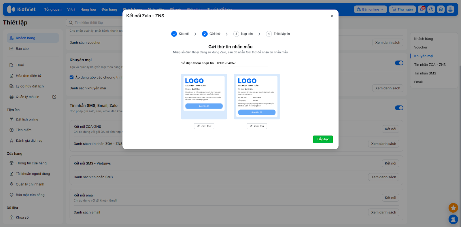 - Để sử dụng chức năng gửi tin nhắn tự động ZNS, bạn cần nạp tiền vào cho tài khoản. Sau khi gửi thử tin nhắn mẫu, bạn kích Tiếp tục để chuyển đến bước Nạp tiền.