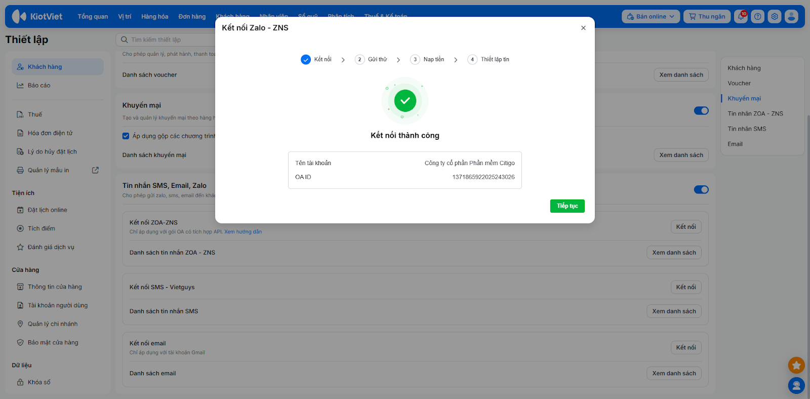 - Tình huống: Bạn vừa đăng ký tài khoản Zalo Official Account (ZOA) cho Salon của mình và muốn kết nối tài khoản này với phần mềm KiotViet để bắt đầu gửi tin nhắn thương hiệu cho khách hàng.