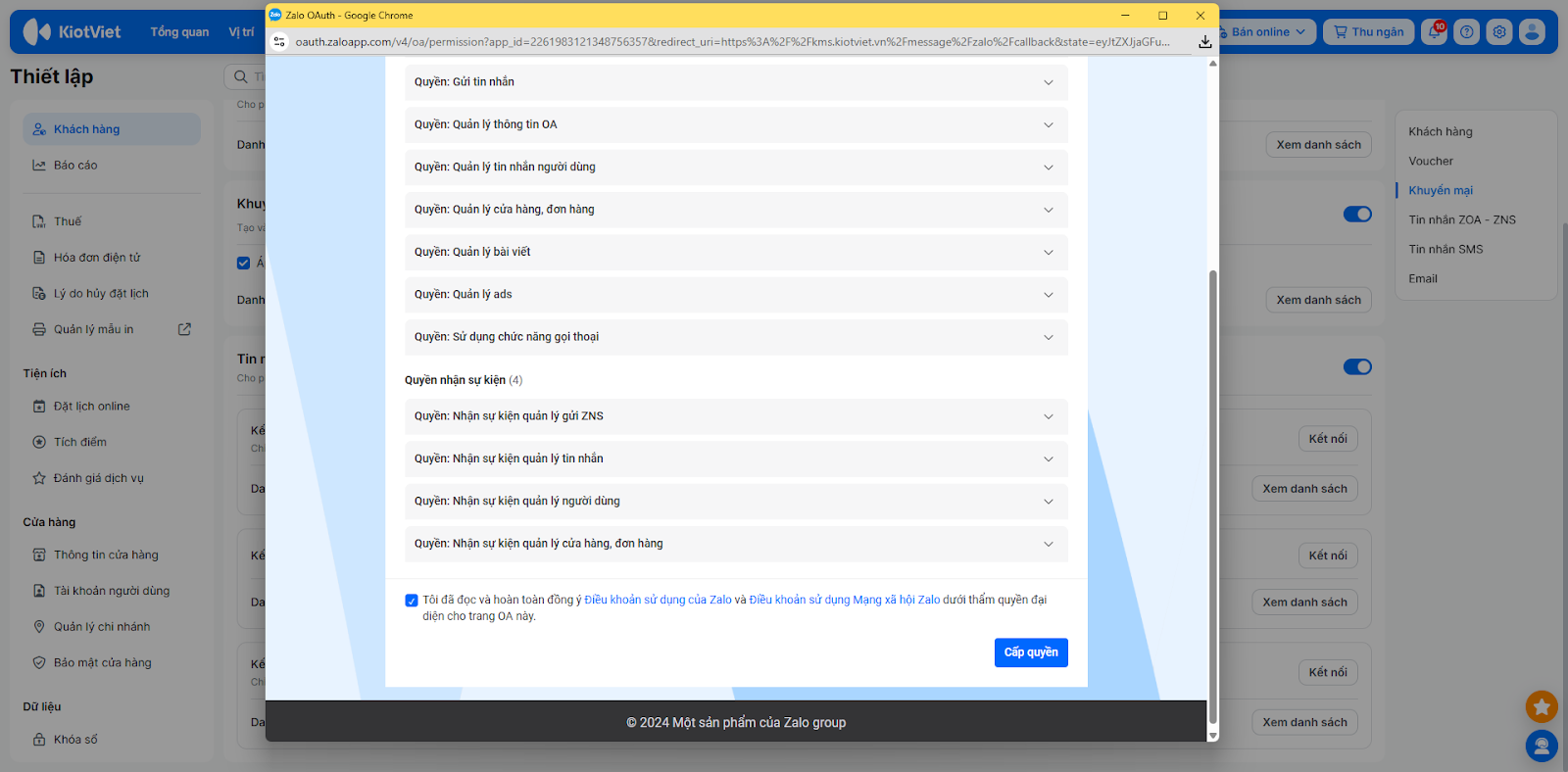 - Tại màn hình cấp quyền, bạn chọn OA của Salon, tích chọn Tôi đã đọc và hoàn toàn đồng ý Điều khoản sử dụng của Zalo và Điều khoản sử dụng Mạng xã hội Zalo dưới thẩm quyền đại diện cho trang OA này và nhấn Cấp quyền.