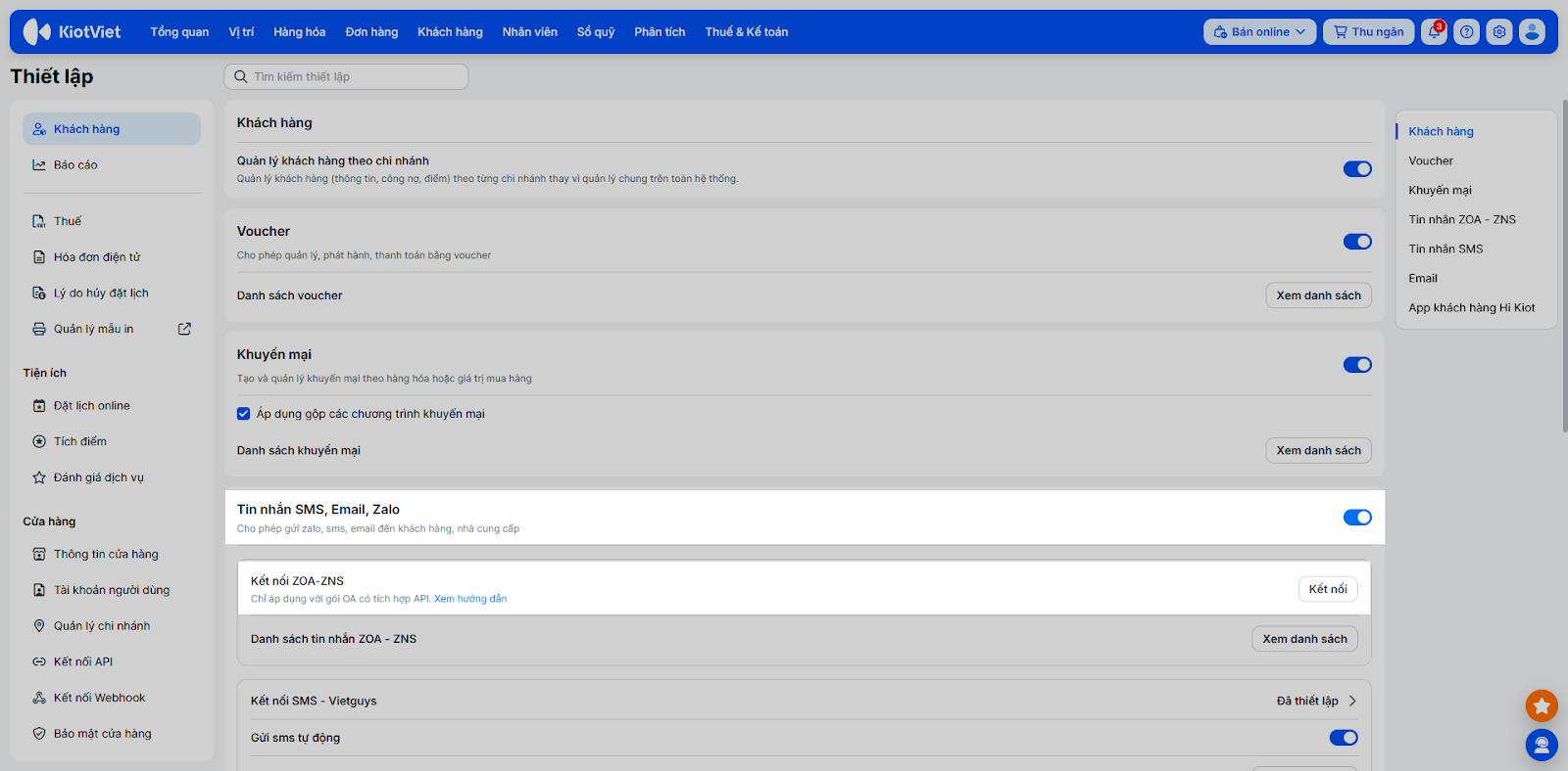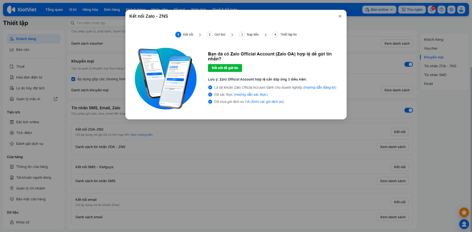 - Bật xanh tính năng Tin nhắn SMS, Email, Zalo → nhấn Kết nối ZOA-ZNS.