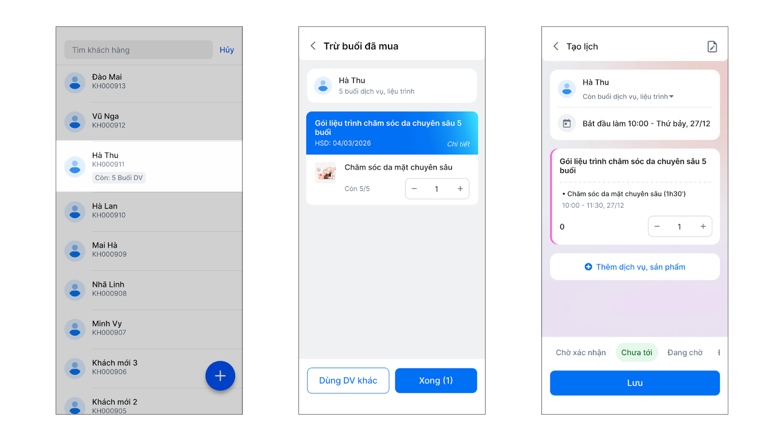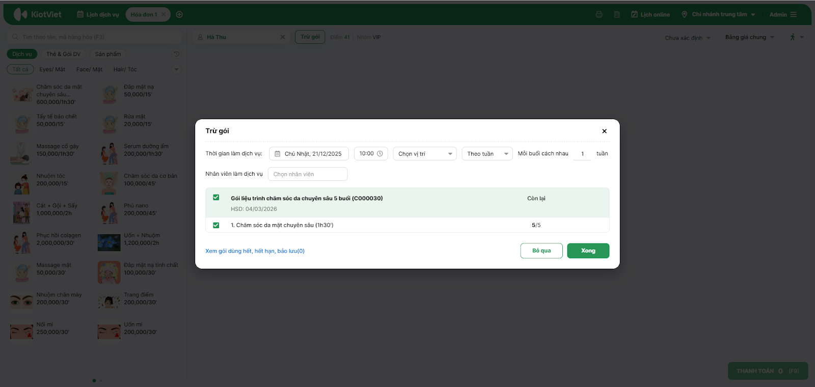 - Tình huống: Khách hàng mua liệu trình “Chăm sóc da chuyên sâu 5 buổi” và muốn đặt lịch cố định vào 10h sáng chủ nhật hàng tuần.