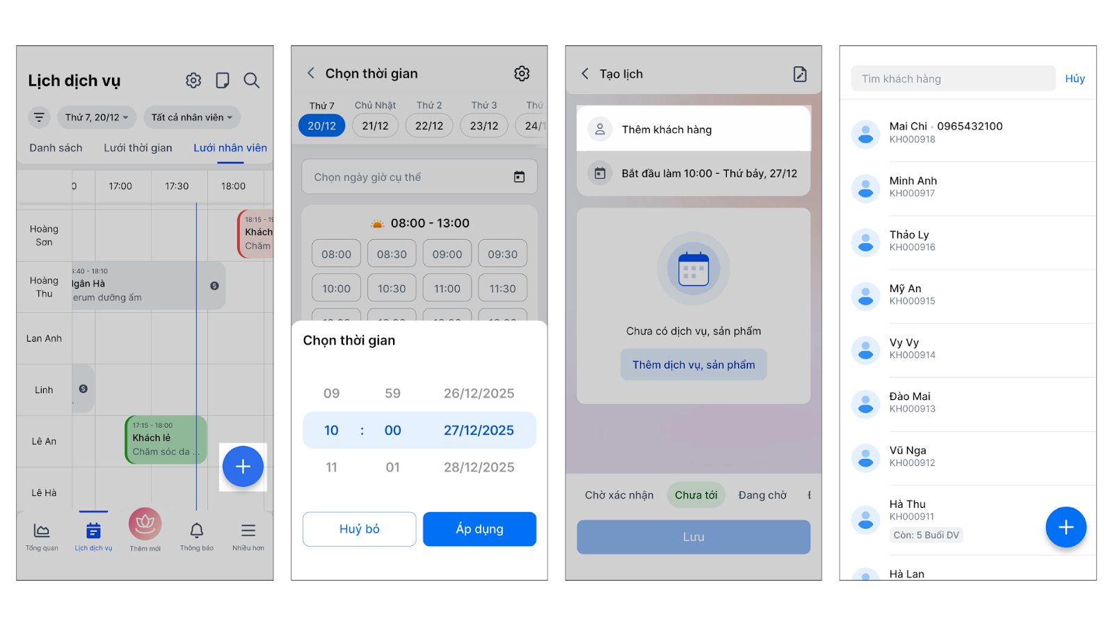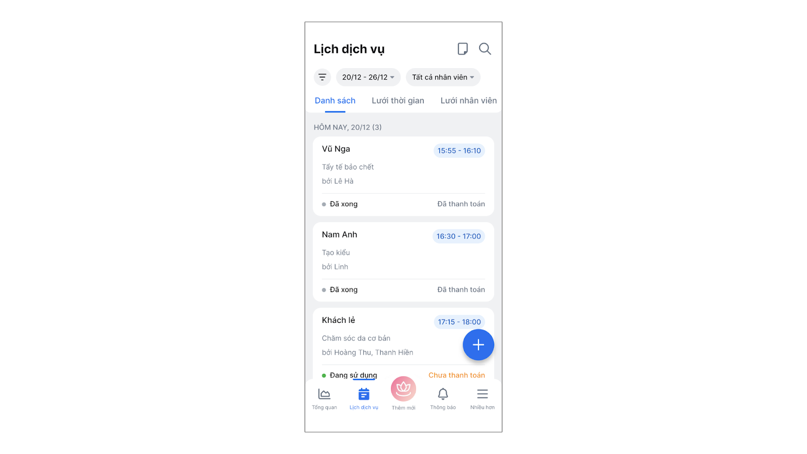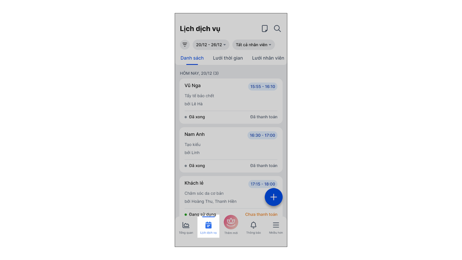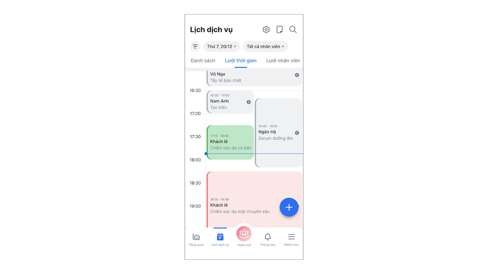 - Lưới nhân viên: Xem theo cột nhân viên (ngang) để biết thợ nào đang rảnh việc.