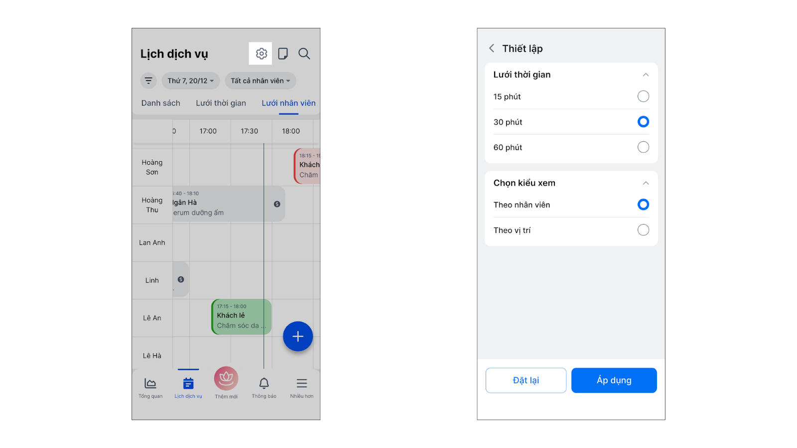 - Bạn có thể tùy chỉnh độ dài ô lưới (15p, 30p, 60p) và kiểu xem theo nhân viên hoặc vị trí trong bánh răng Thiết lập để phù hợp với thời gian làm dịch vụ trung bình của tiệm.