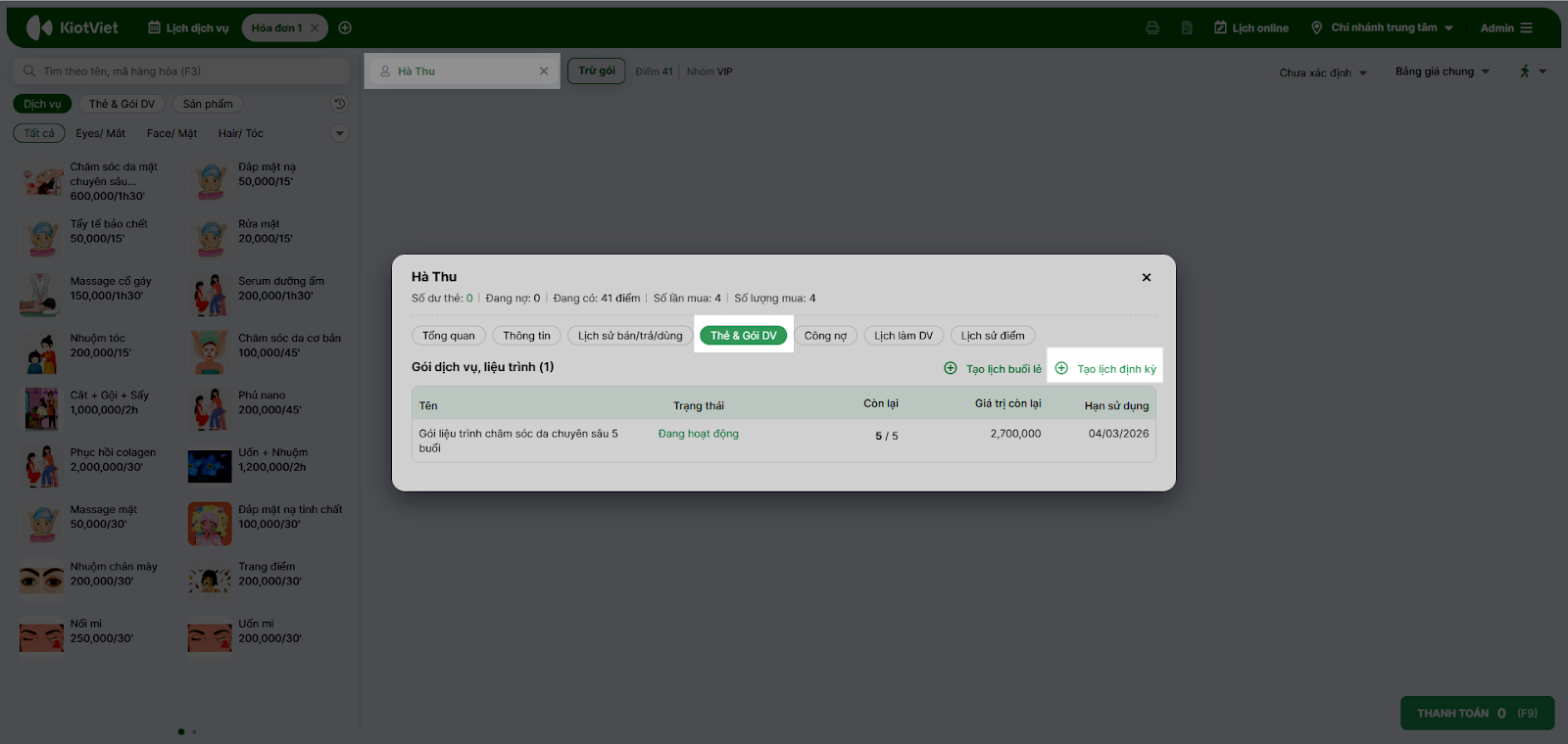 - Chọn tên khách → chọn tab Thẻ & Gói DV → chọn + Tạo lịch định kỳ.