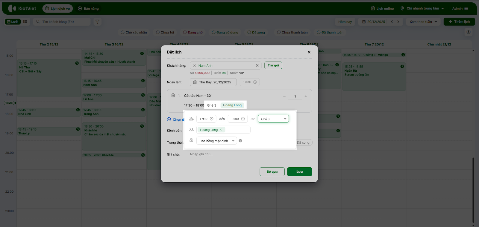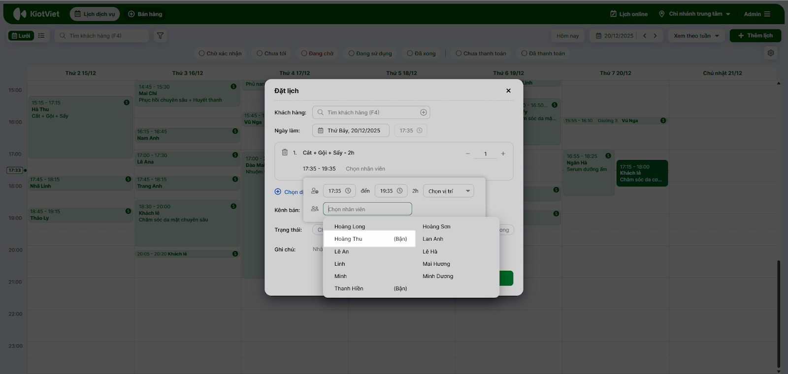 - Chọn nhân viên “Hoàng Long” và ghế trống.