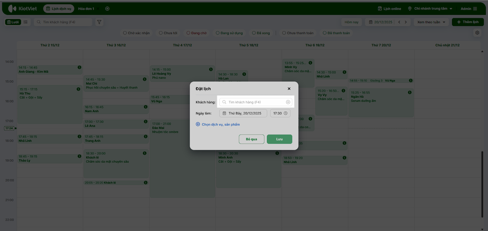- Kích vào nút Thêm lịch hoặc kích trực tiếp vào khung giờ trống trên Lưới dịch vụ (Ví dụ: ô 17h30).