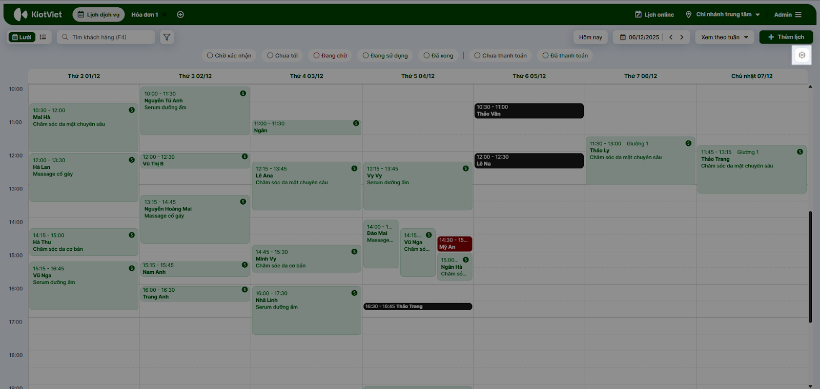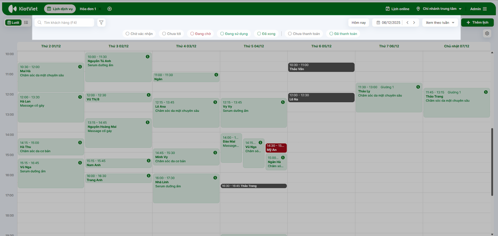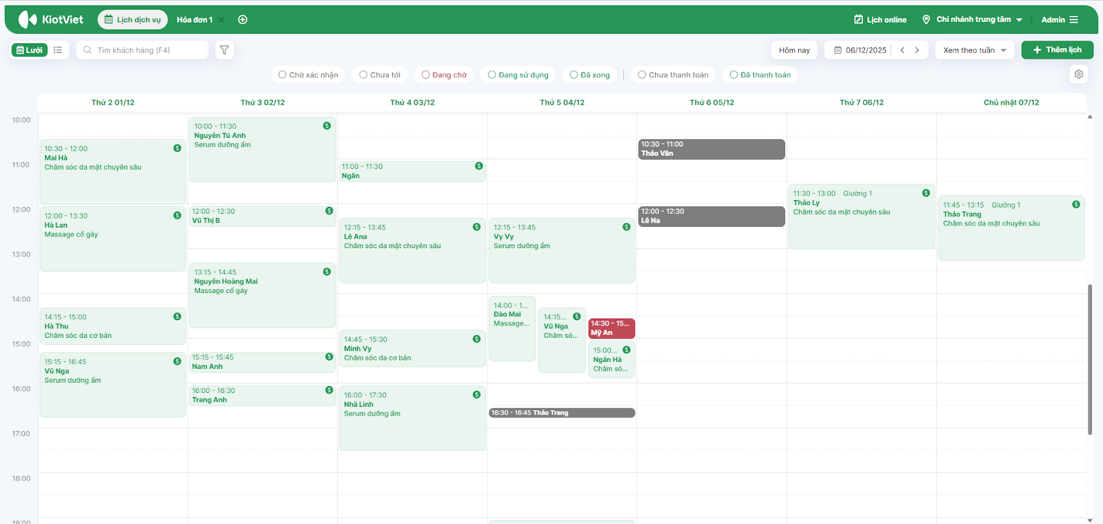 - Tình huống: Đầu ngày, quản lý cần kiểm tra tổng quan các lịch hẹn trong tuần để sắp xếp ca làm việc cho nhân viên.