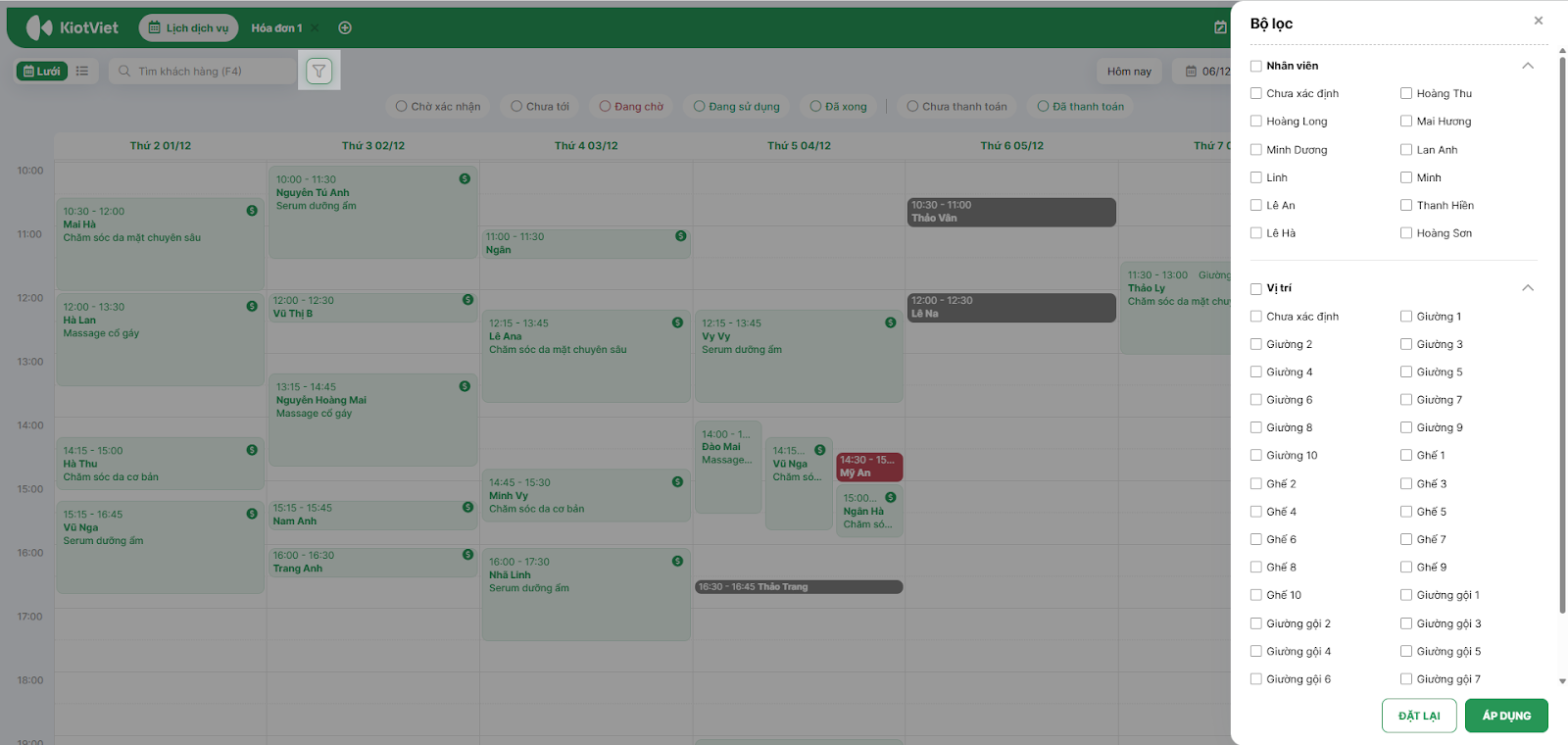 để lọc hiển thị theo Vị trí/Phòng hoặc theo Nhân viên để xem ai đang trống lịch.