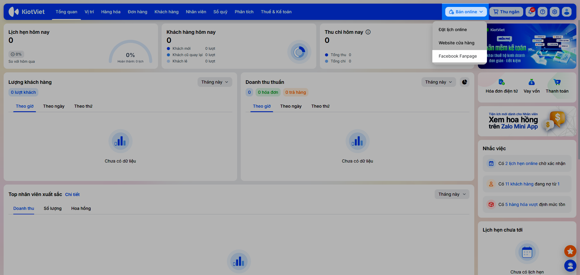– Tại màn hình Quản lý, từ menu Bán Online, bạn chọn Facebook Fanpage.