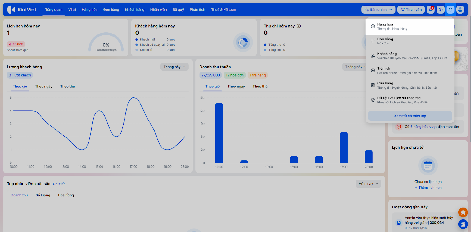 - Tại màn hình Quản lý, bạn vào menu Thiết lập → chọn Hàng hóa.