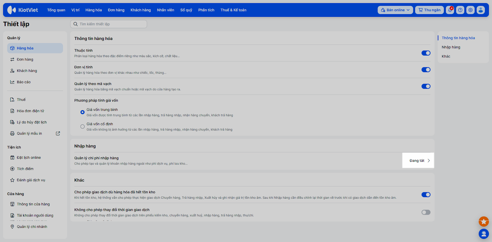 - Trên dòng Quản lý chi phí nhập hàng → nhấn Đang tắt.