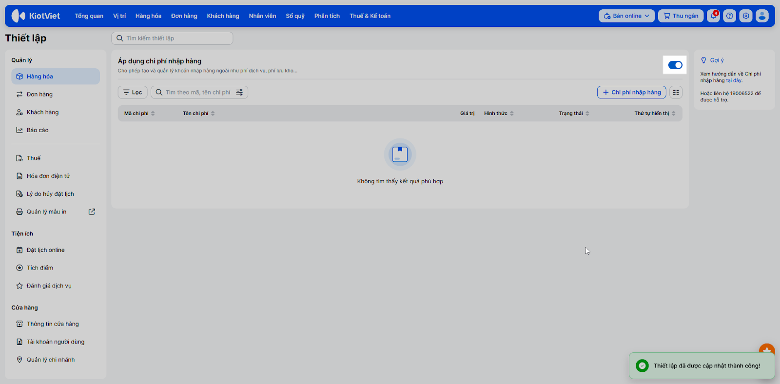 - Tình huống: Trước khi bắt đầu ghi nhận các khoản chi phí nhập hàng, bạn cần kích hoạt tính năng này trên gian hàng KiotViet của Salon.