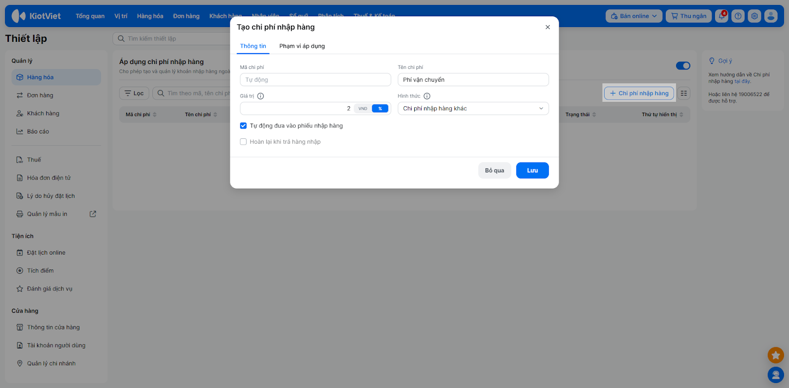 - Tự động đưa vào phiếu nhập hàng: Nếu tích chọn, mỗi khi tạo phiếu nhập, hệ thống sẽ tự động cộng thêm chi phí này.