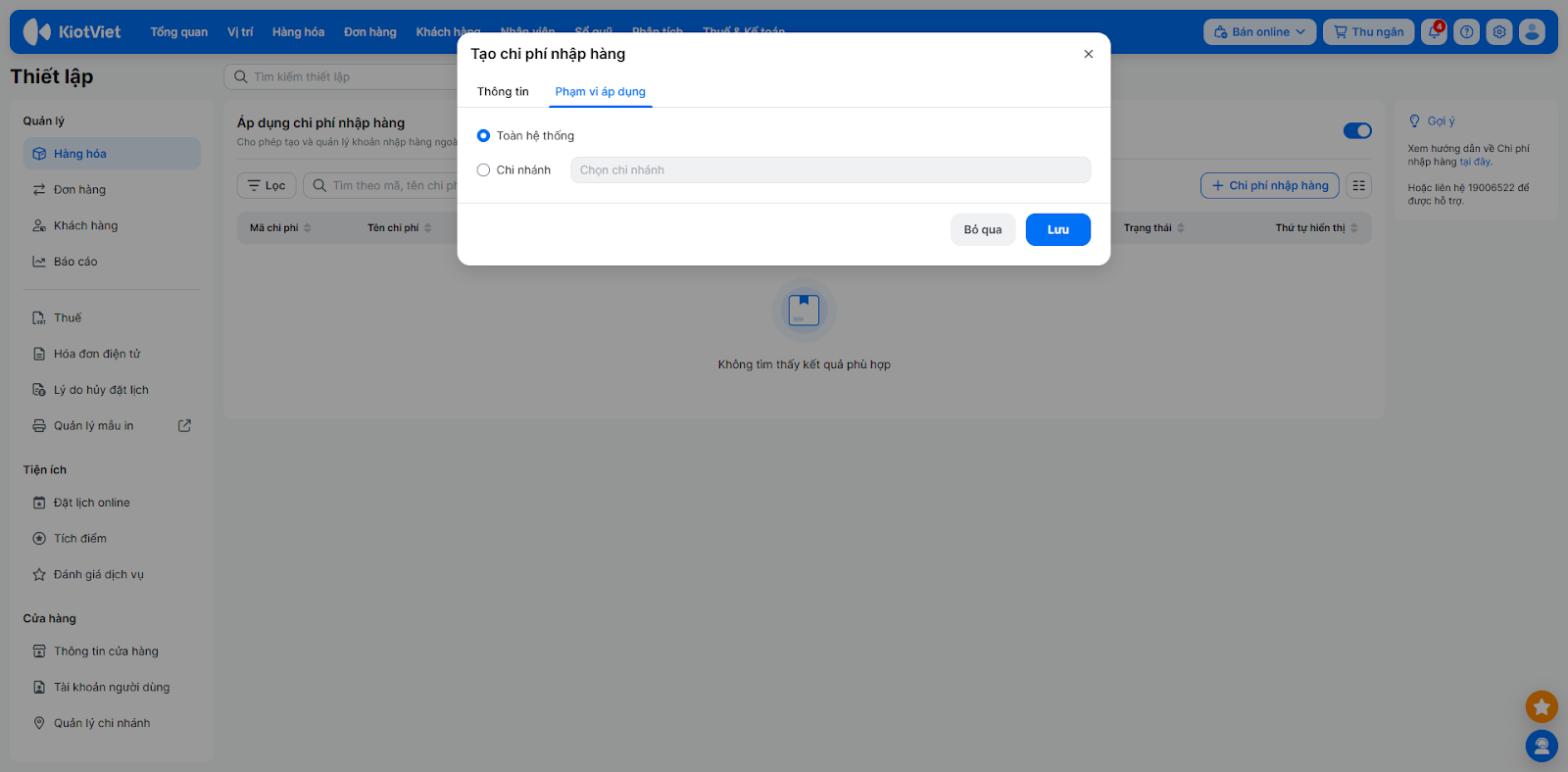 - Phạm vi áp dụng: Chọn Toàn hệ thống hoặc cá chi nhánh cụ thể.
