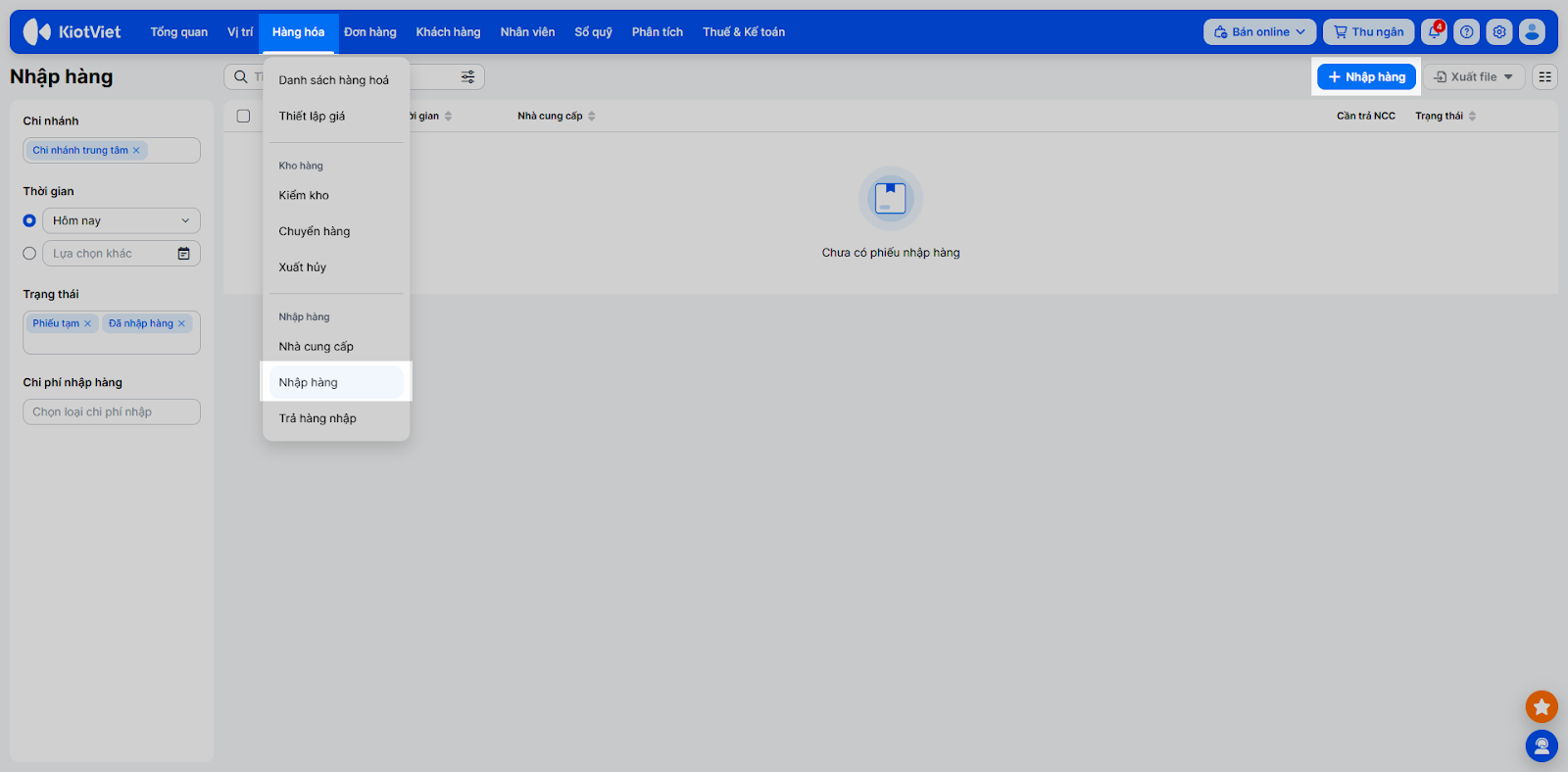 - Vào menu Hàng hóa → Nhập hàng → chọn + Nhập hàng.