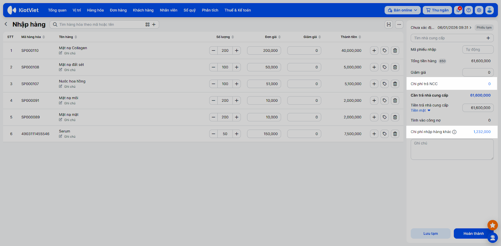 - Tình huống: Bạn nhập một lô mỹ phẩm mới. Ngoài tiền hàng trả cho hãng, bạn mất thêm phí vận chuyển. Bạn cần tạo phiếu nhập ghi nhận cả hai khoản này.