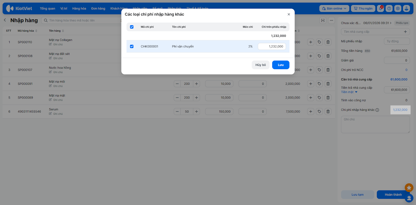 - Chi phí nhập hàng khác: Chọn nếu đây là khoản phí trả cho bên thứ 3 (Ví dụ: Bạn tự thuê Shipper ngoài để chở lô dầu gội về Salon).