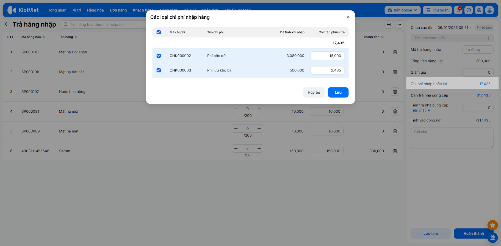 - Hoàn lại khi trả hàng nhập: Nếu tích chọn, khi bạn trả hàng lại cho NCC, hệ thống sẽ tính toán để đòi lại khoản phí này.