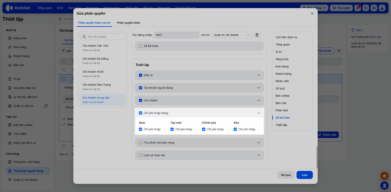 - Phân quyền tài khoản người dùng: Bạn có thể phân quyền chi tiết cho nhân viên cá quyền: Xem, Tạo mới, Chỉnh sửa, Xóa chi phí nhập để đảm bảo bảo mật dữ liệu.