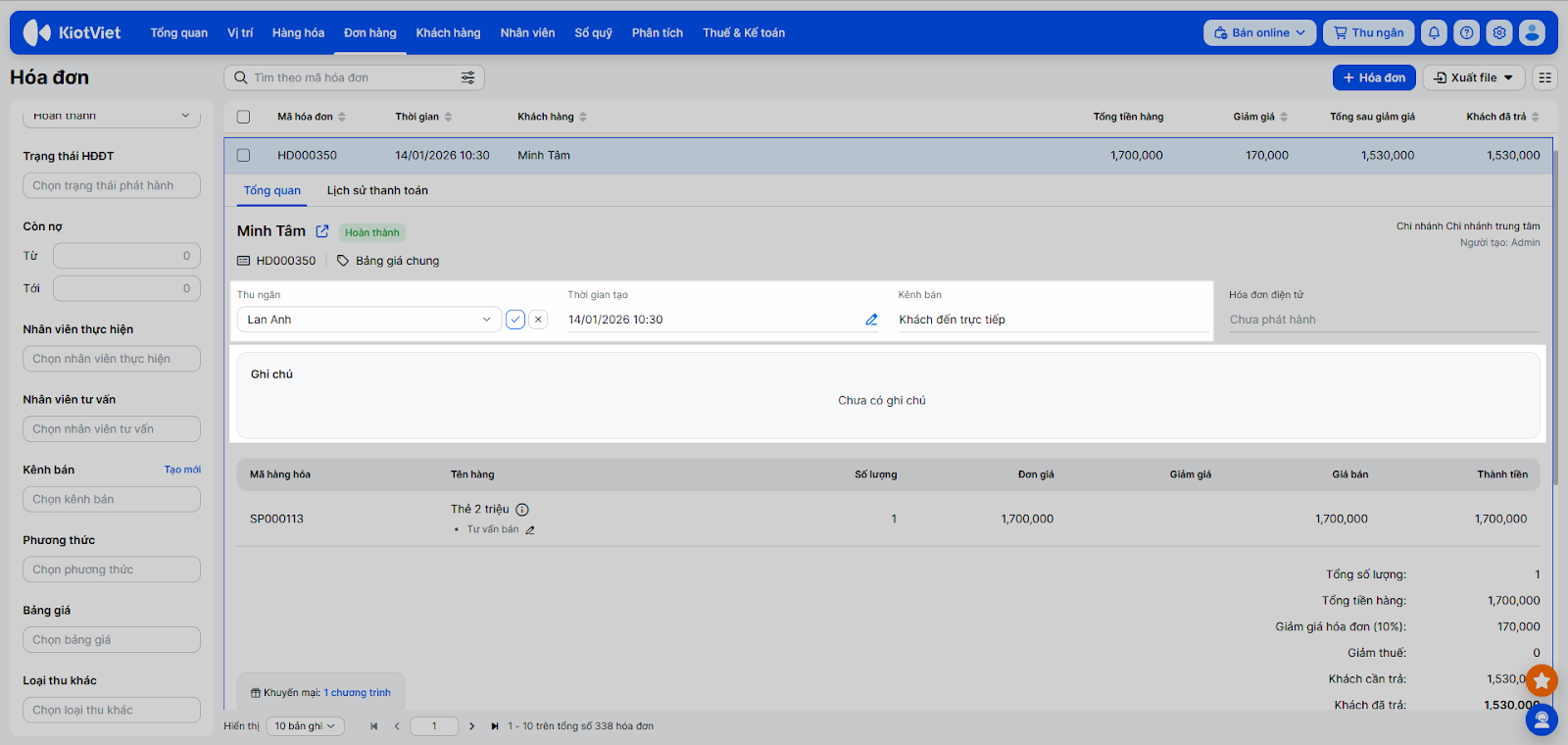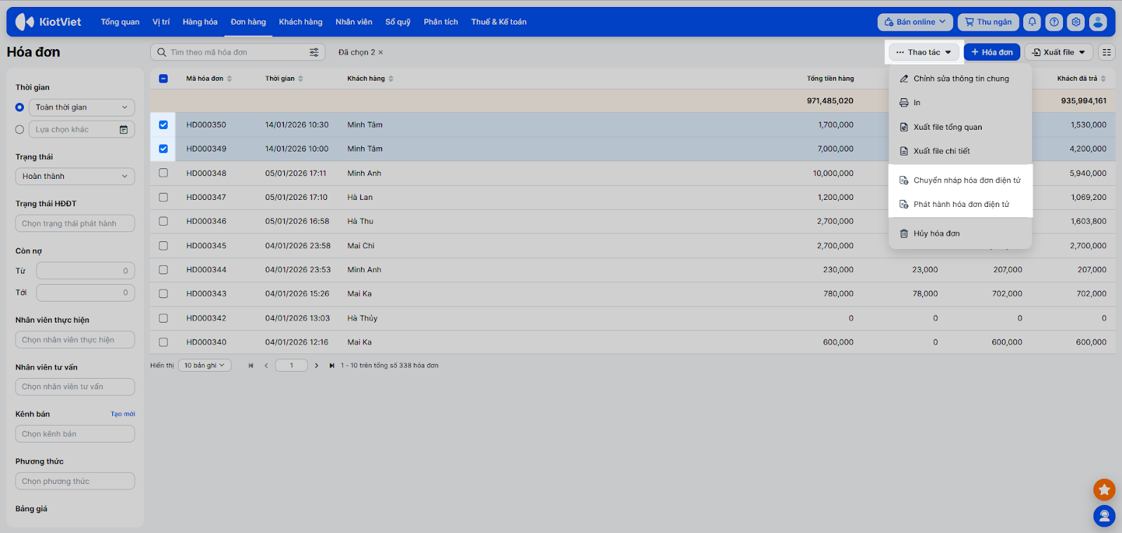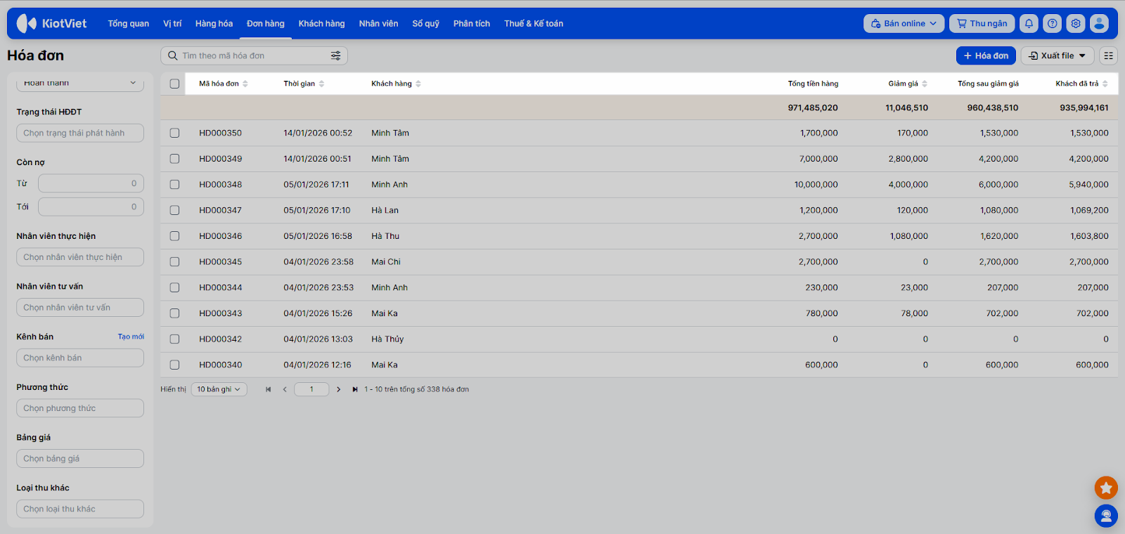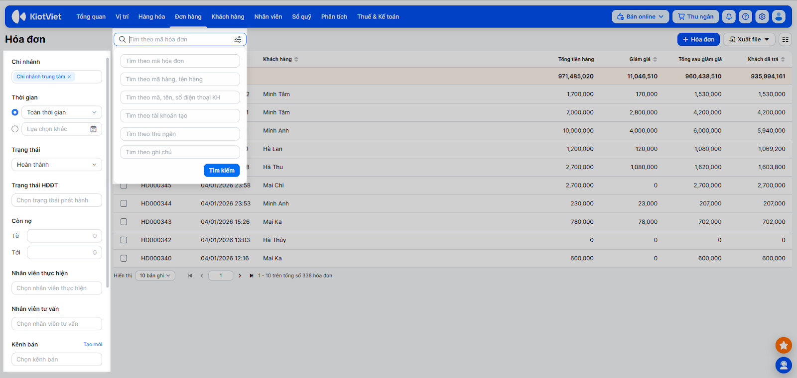 - Tìm kiếm: Sử dụng ô tìm kiếm và bộ lọc bên trái màn hình để tìm kiếm theo các thông tin: Mã hóa đơn; mã hàng, tên hàng; mã, tên, số điện thoại khách hàng; tài khoản tạo; thu ngân; ghi chú; bộ lọc chi nhánh; thời gian; trạng thái, trạng thái HĐĐT; còn nợ; nhân viên thực hiện; nhân viên tư vấn; kênh bán; phương thức; bảng giá; loại thu khác.
