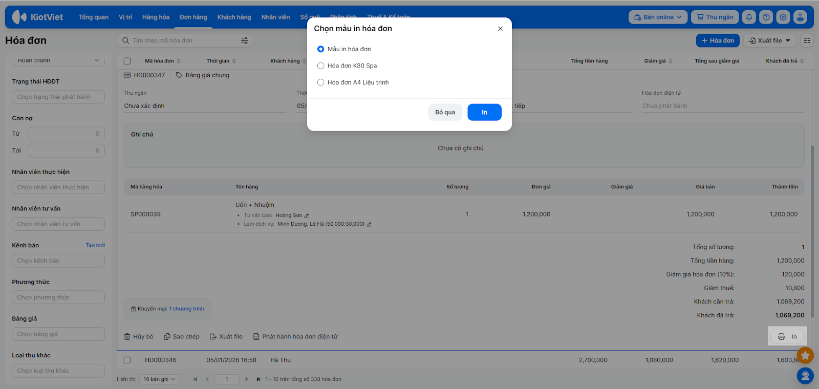 - In lại: Mở hóa đơn → nhấn In → chọn mẫu in nếu gian hàng có nhiều mẫu → xác nhận In.