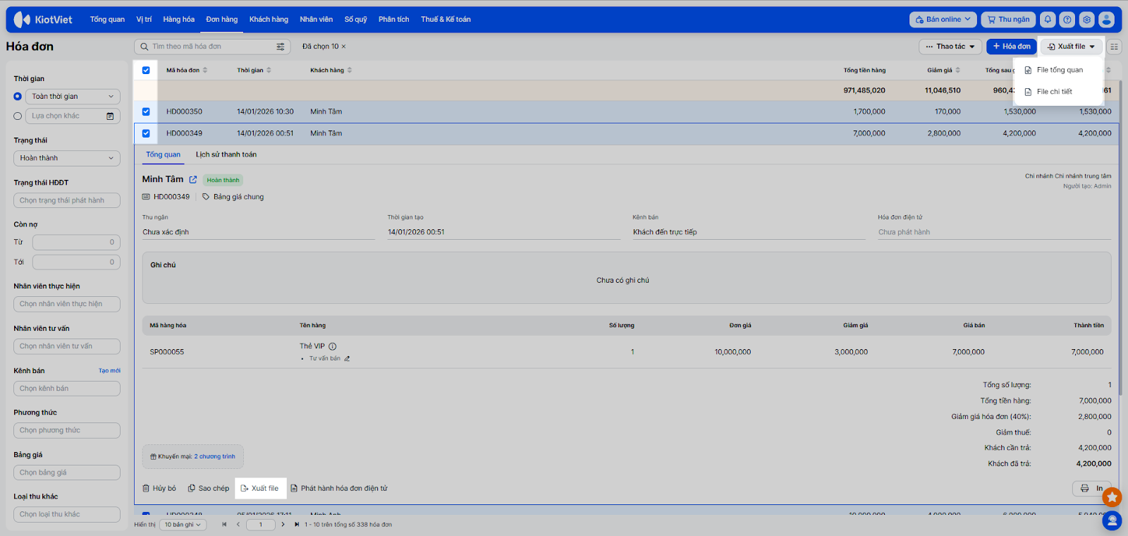 - Tại màn hình danh sách, nhấn Xuất file (Tổng quan hoặc Chi tiết) để phục vụ báo cáo/kế toán.