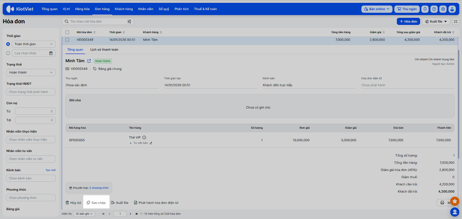 Giúp tạo nhanh đơn mới dựa trên đơn cũ. Trên chi tiết hóa đơn bạn nhấn Sao chép.