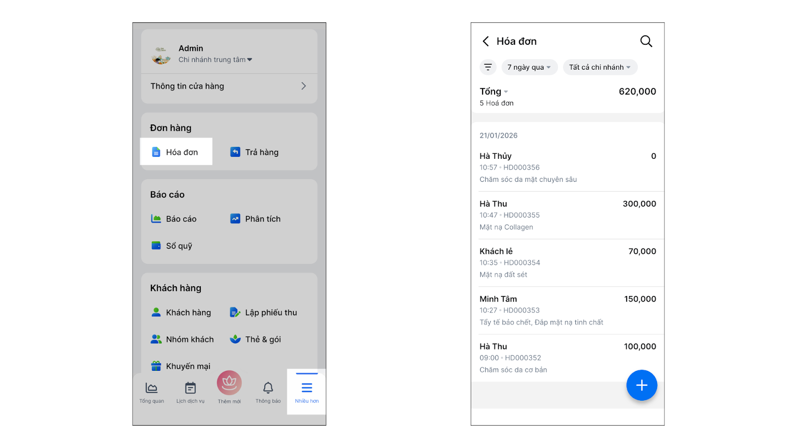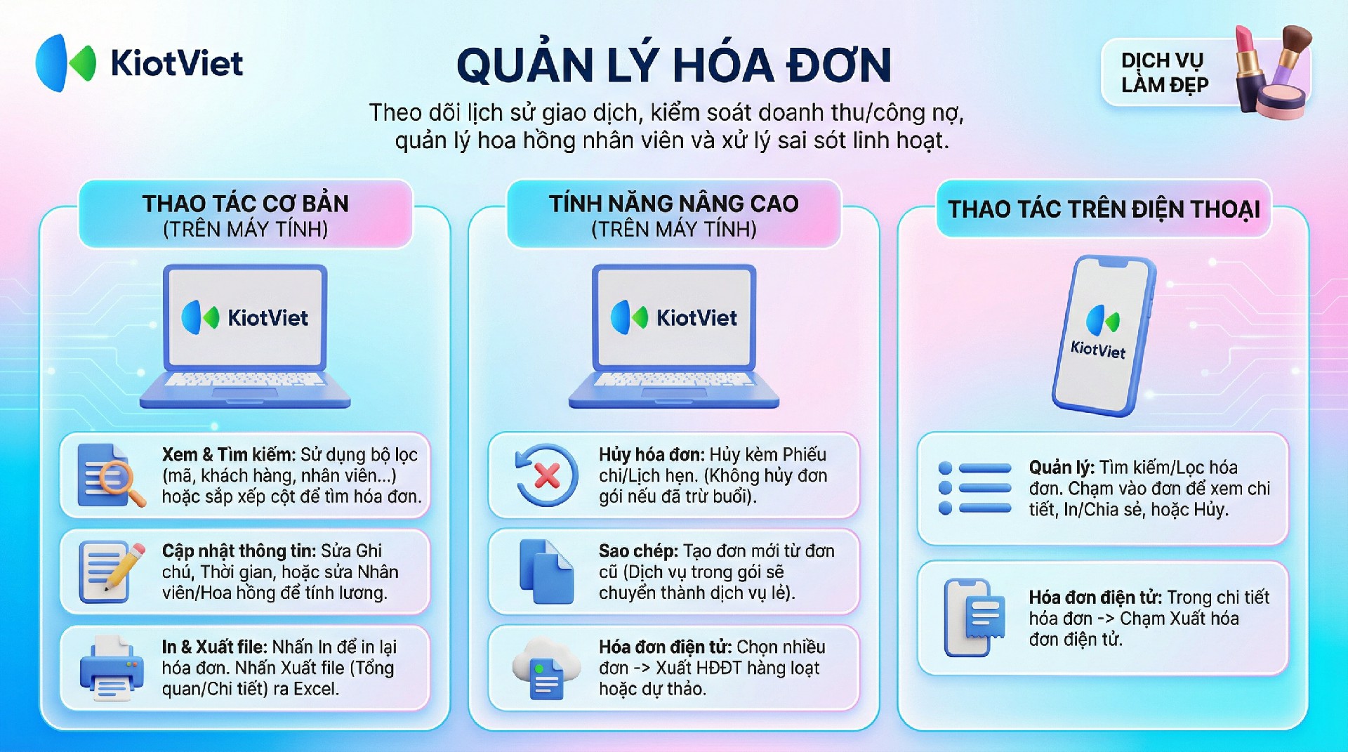Tính năng Quản lý Hóa đơn giúp chủ Salon theo dõi toàn bộ lịch sử giao dịch bán hàng, dịch vụ, bán gói liệu trình và thẻ tài khoản.