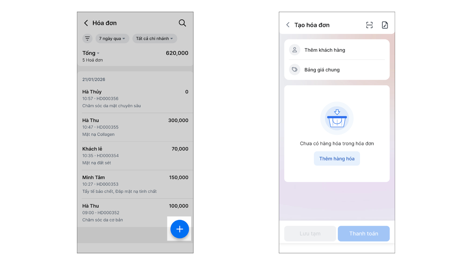 - Tạo hóa đơn mới: Chạm biểu tượng dấu cộng để chuyển nhanh sang màn hình Tạo hóa đơn.