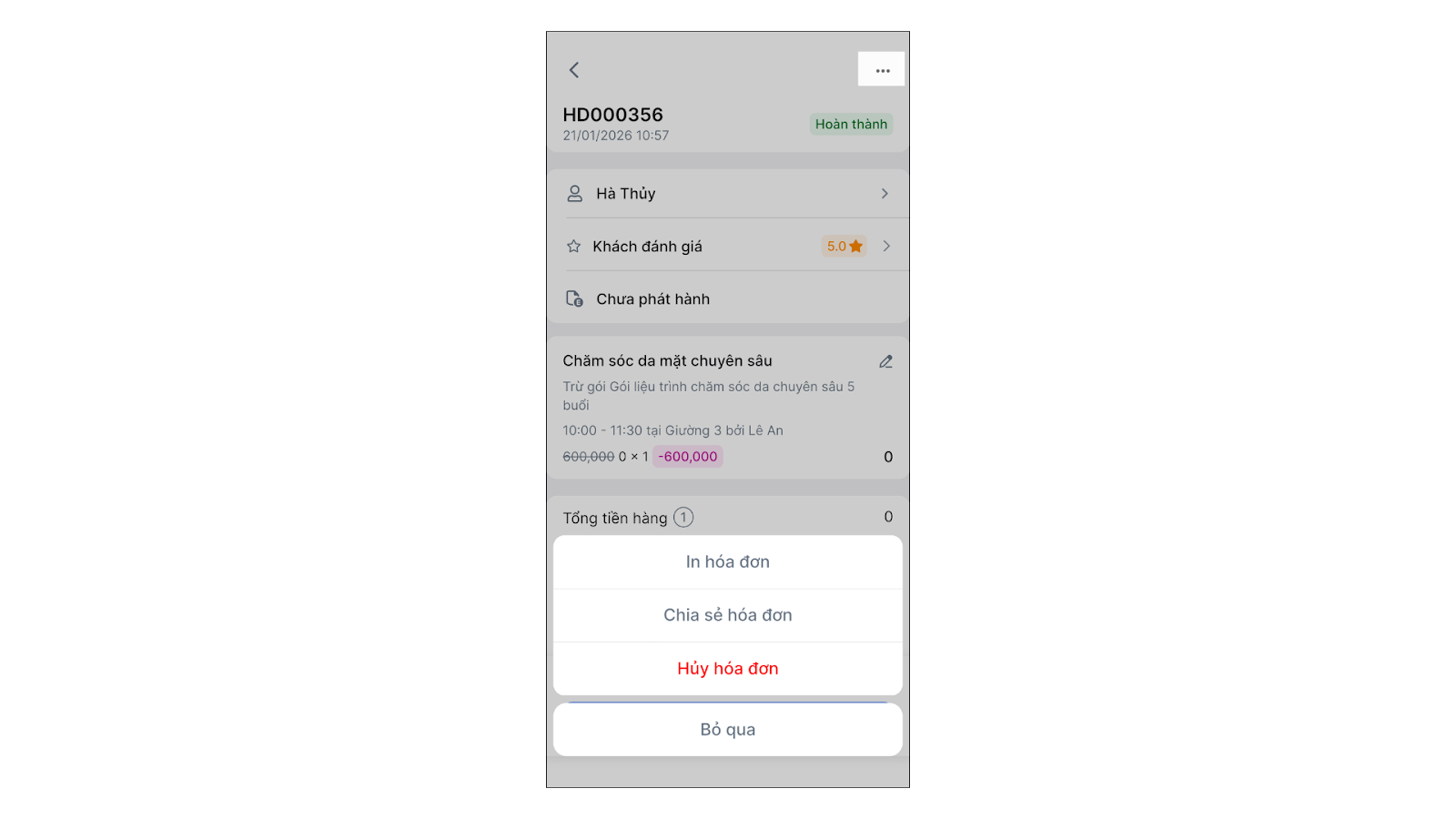 - Gói dịch vụ/Thẻ tài khoản: Nếu hóa đơn là bán Gói/Thẻ và khách đã sử dụng dịch vụ trong gói đó (đã trừ buổi), hệ thống sẽ không cho phép hủy hóa đơn bán gói ngay. Bạn phải hủy các phiếu sử dụng dịch vụ trước.
