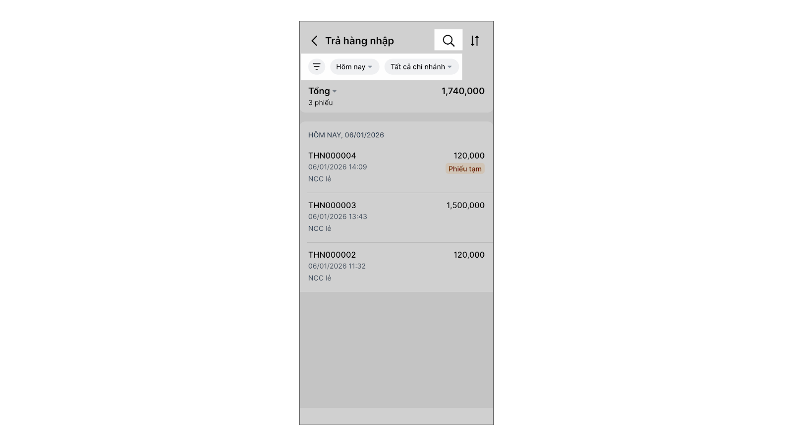 - Chạm vào một phiếu bất kỳ để xem chi tiết: hàng hóa nào đã trả, số lượng bao nhiêu, đã nhận lại tiền chưa.