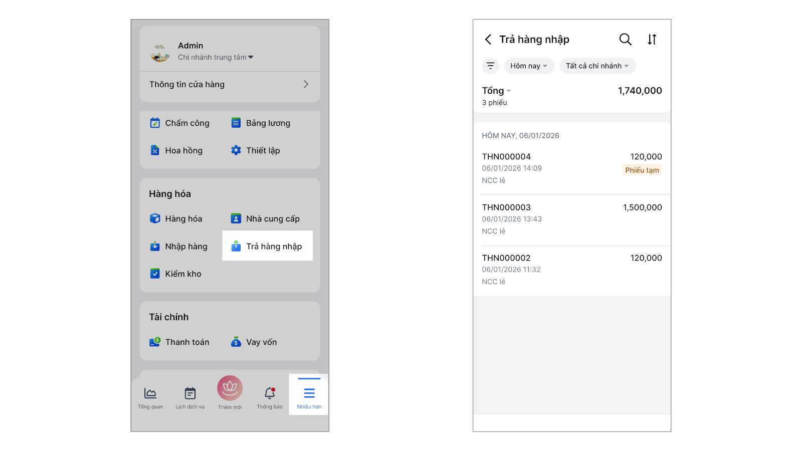 - Trên menu Nhiều hơn, chạm vào Trả hàng nhập.
