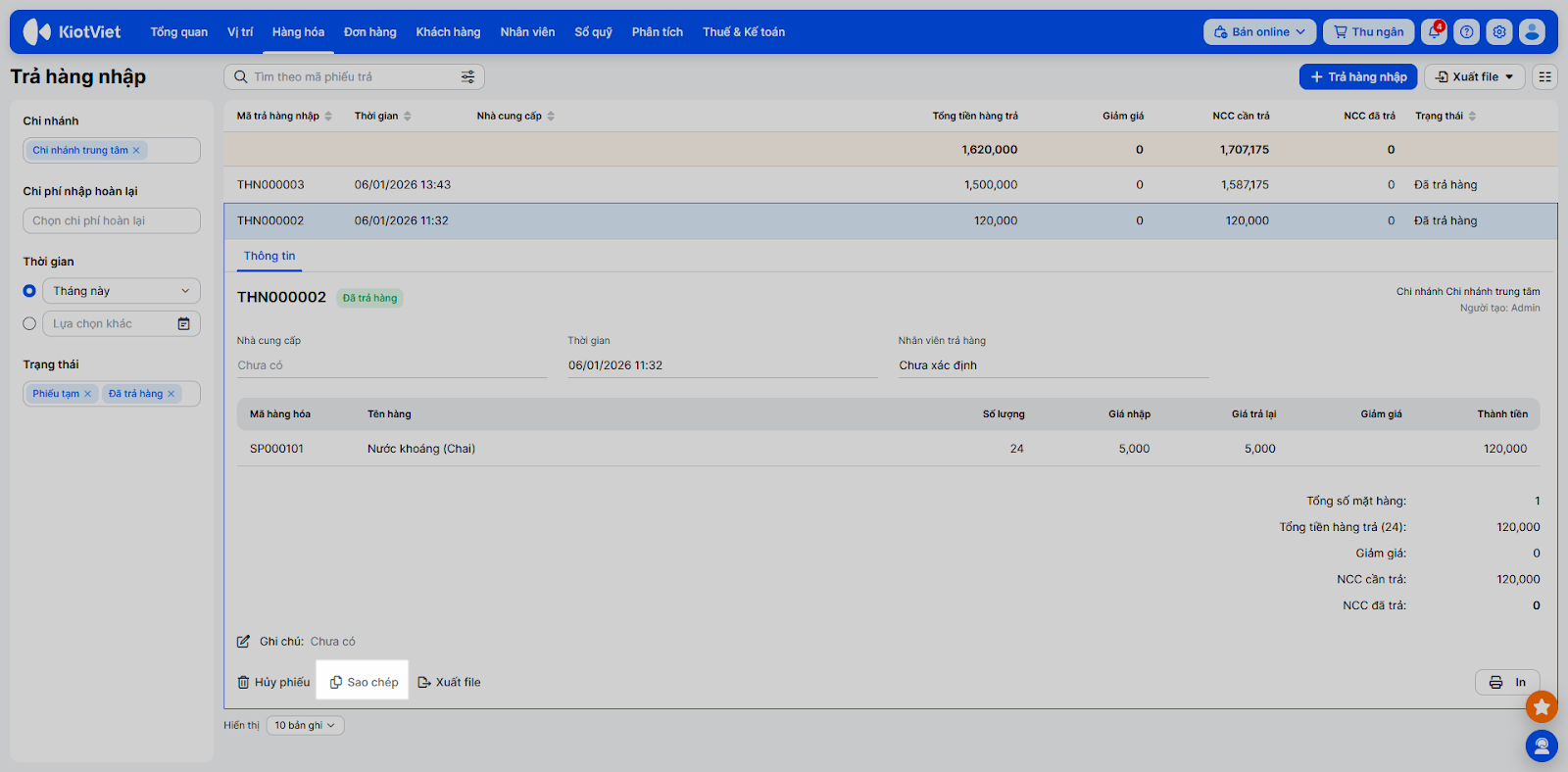 1. Cập nhật, Hủy và Sao chép phiếu trả hàng nhập