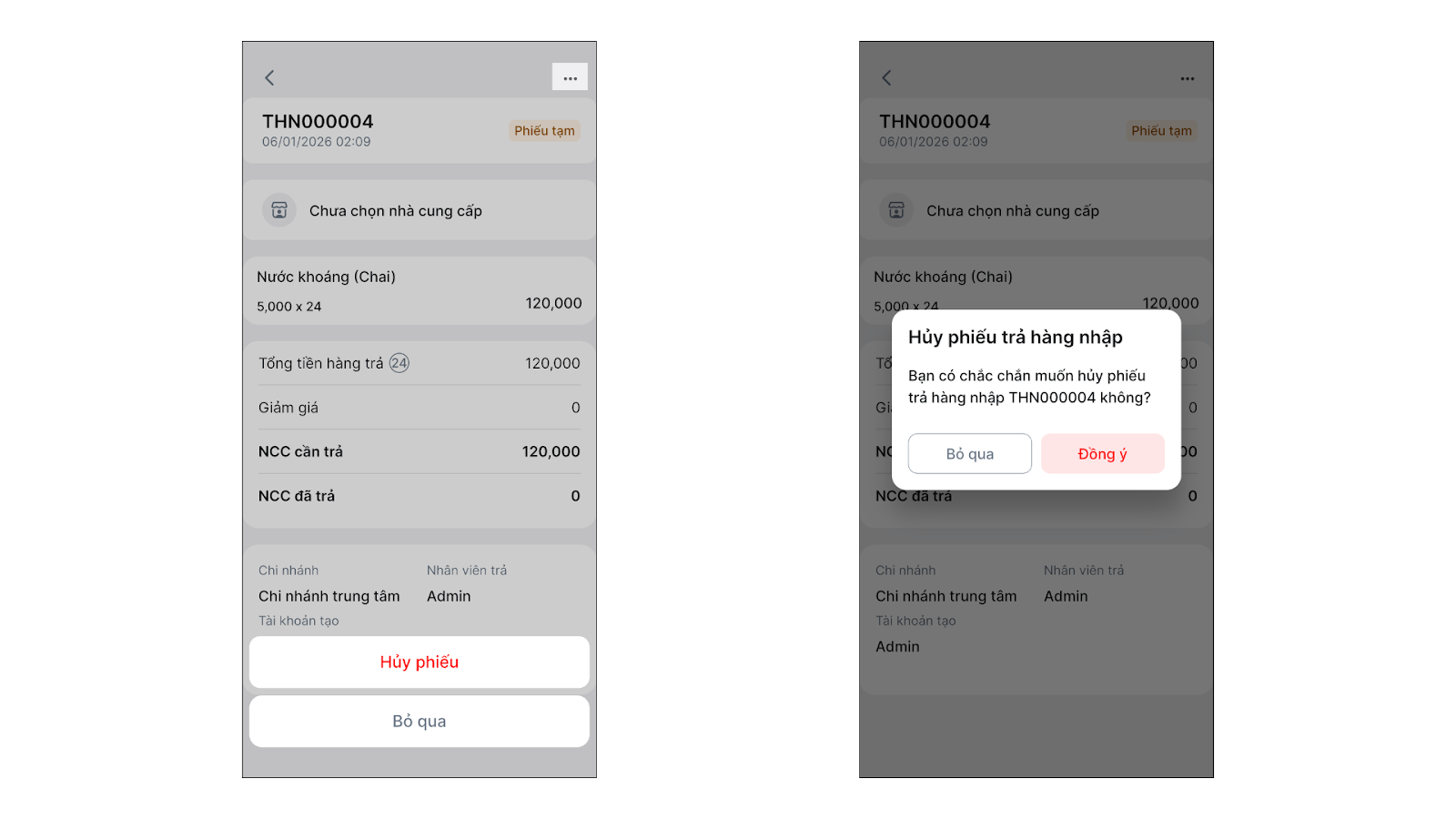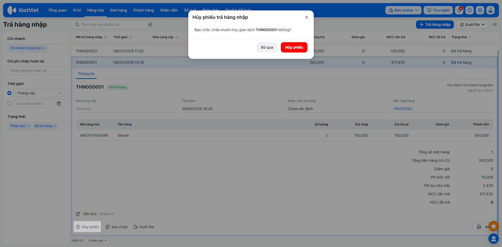 2. Hủy phiếu trả hàng nhập