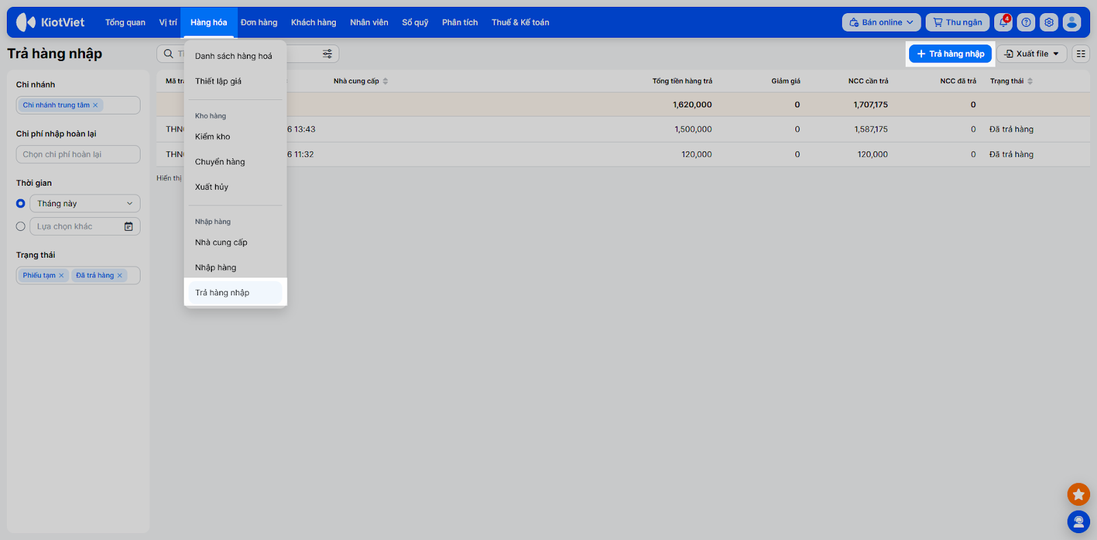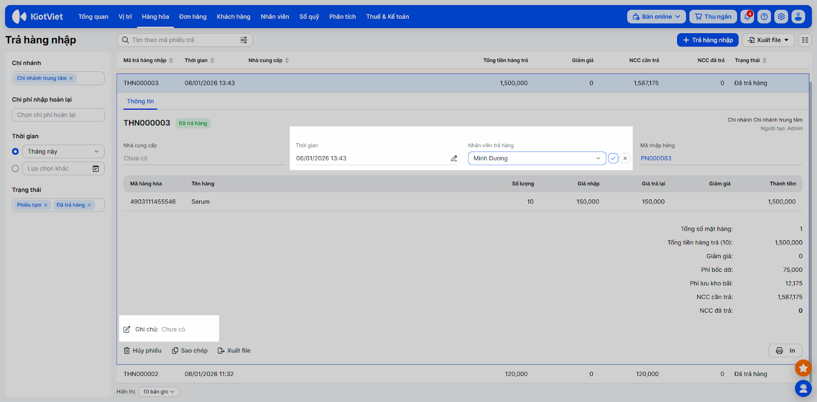 - Tìm kiếm: Vào Hàng hóa → Trả hàng nhập. Sử dụng bộ lọc và ô tìm kiếm để tìm kiếm đúng phiếu.