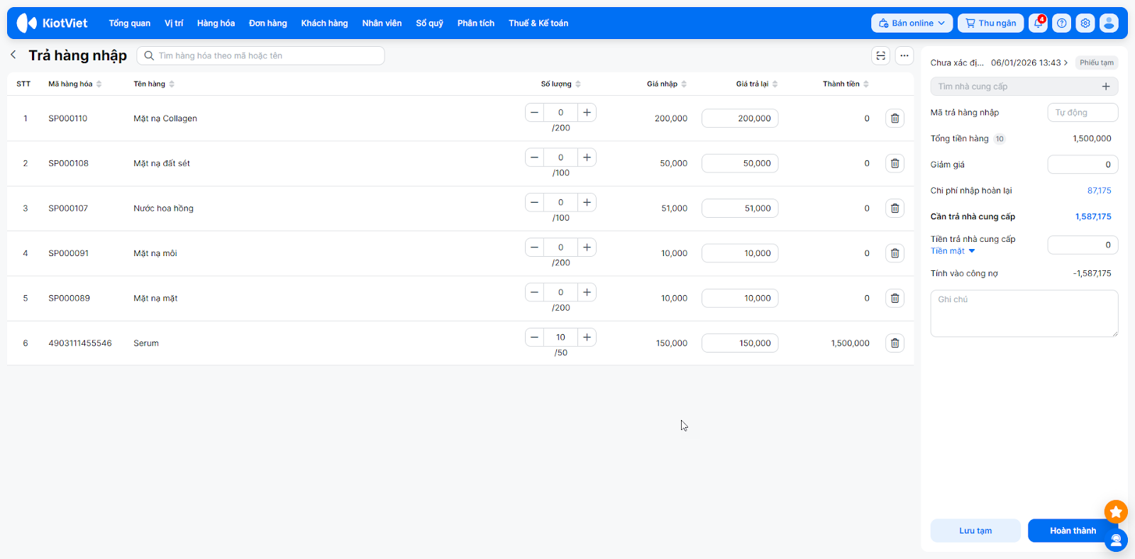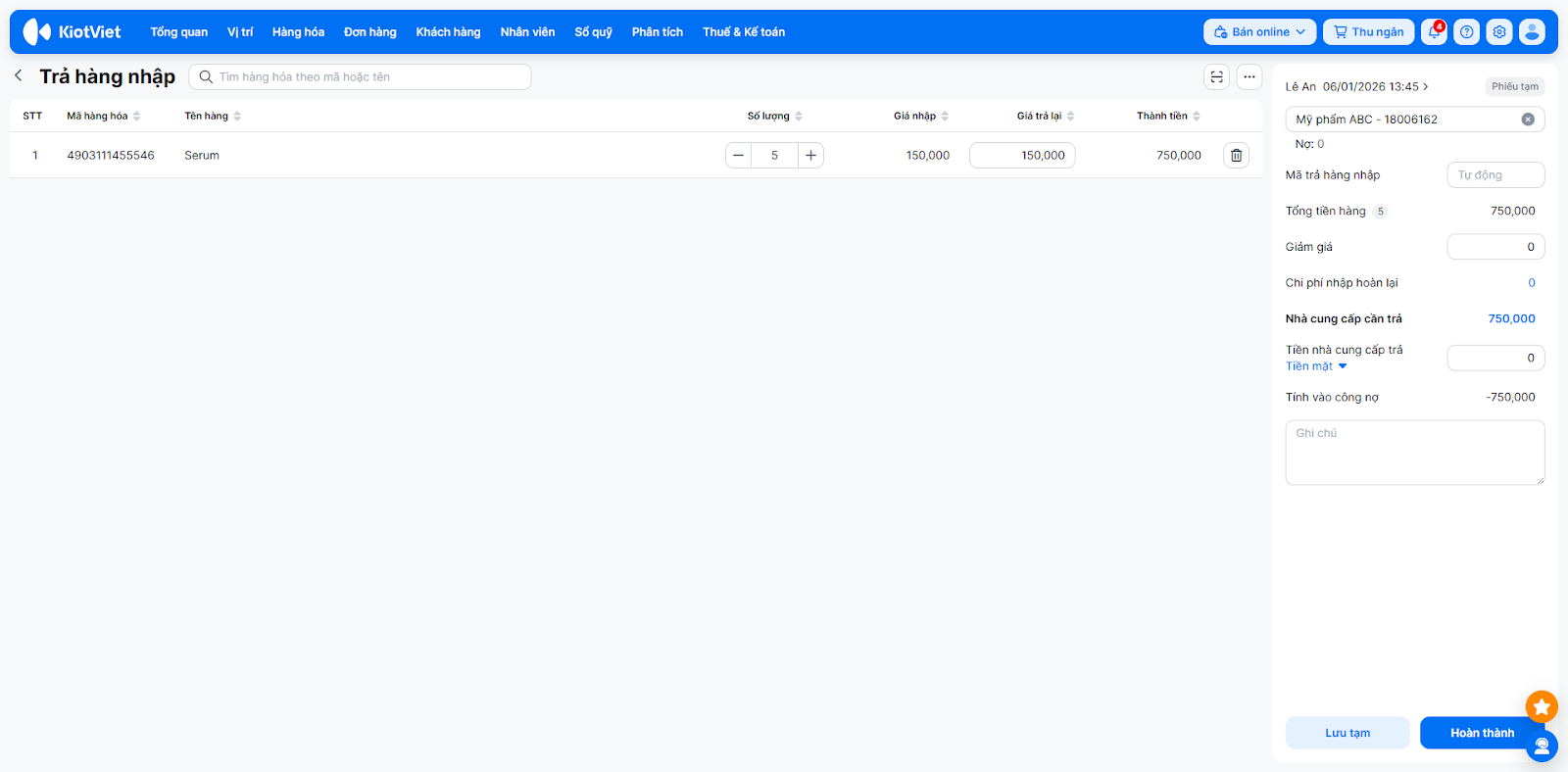 - Tình huống: Hôm qua bạn vừa nhập lô 50 chai serum, nhưng hôm nay kiểm tra lại thấy có 10 chai giao sai mã. Bạn muốn trả lại đúng 10 chai của lô hàng hôm qua để đảm bảo giá vốn được tính đúng theo phiếu nhập đó.