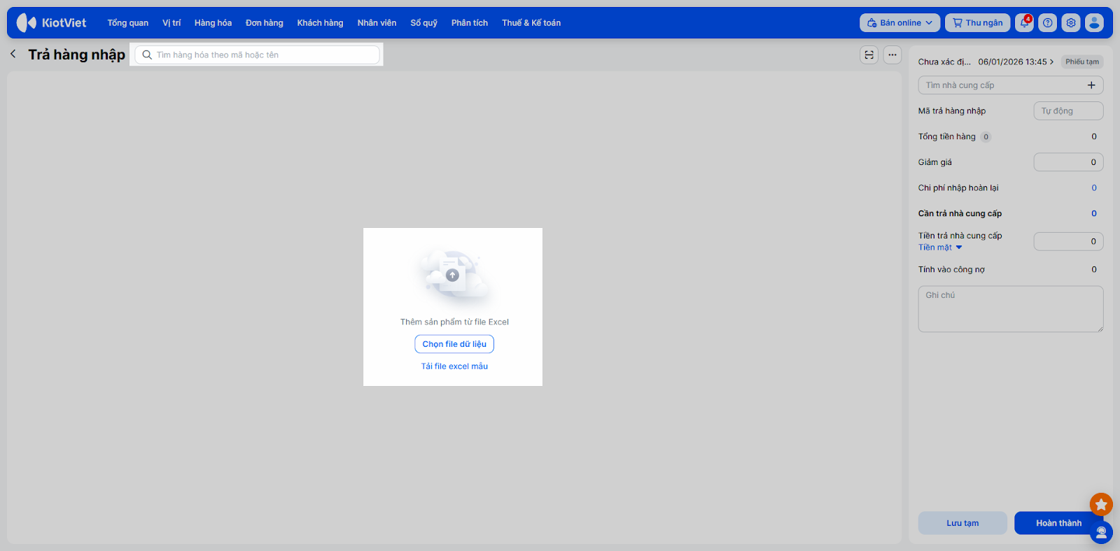 - Chọn hàng hóa: Tìm kiếm tên/mã hàng hoặc Import từ file Excel (nếu danh sách nhiều).