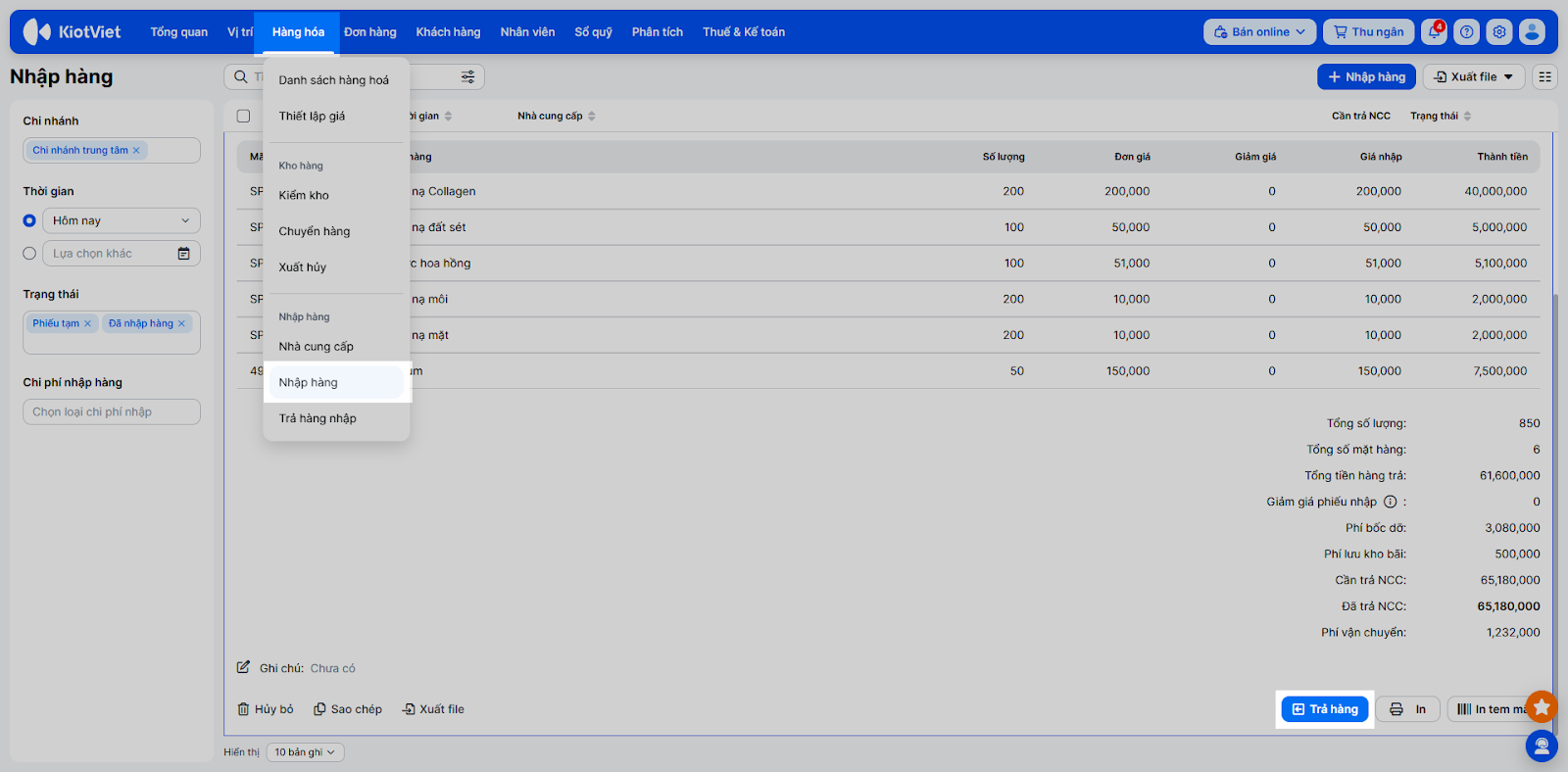 - Tình huống: Bạn phát hiện trong kho có 5 chai serum bị rò rỉ nắp. Bạn muốn trả lại số hàng này cho nhà cung cấp “Mỹ phẩm ABC” để đổi hàng mới hoặc lấy lại tiền, nhưng không nhớ 5 chai này thuộc phiếu nhập ngày nào.