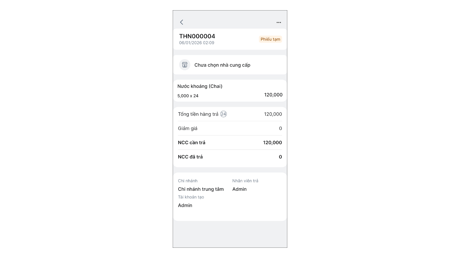 - Nếu nhà cung cấp chưa trả tiền ngay (trừ công nợ), để số tiền là 0.