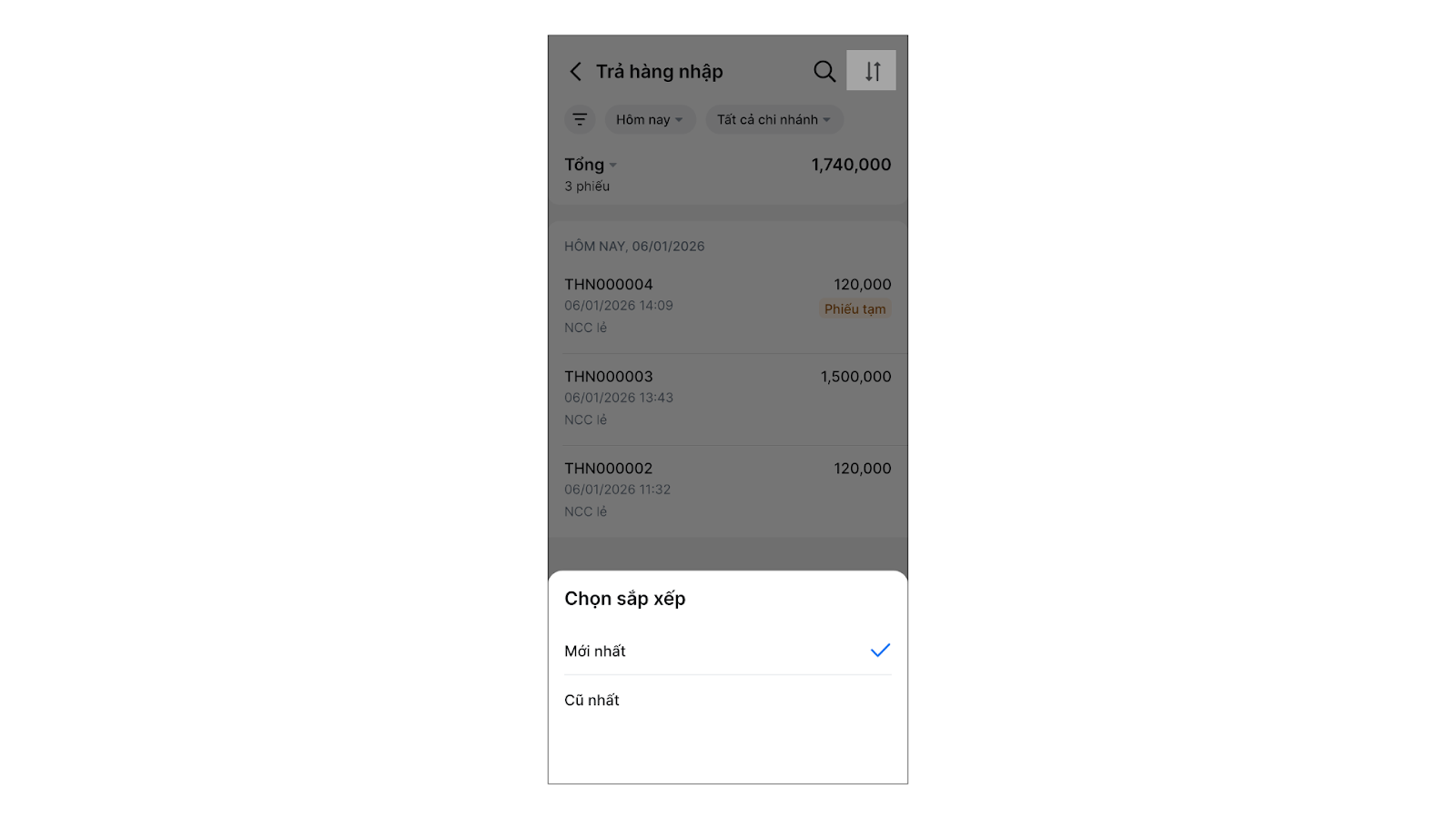 - Để sắp xếp phiếu trả hàng nhập, bạn chọn biểu tượng mũi tên 2 chiều → chọn Mới nhất hoặc Cũ nhất.
